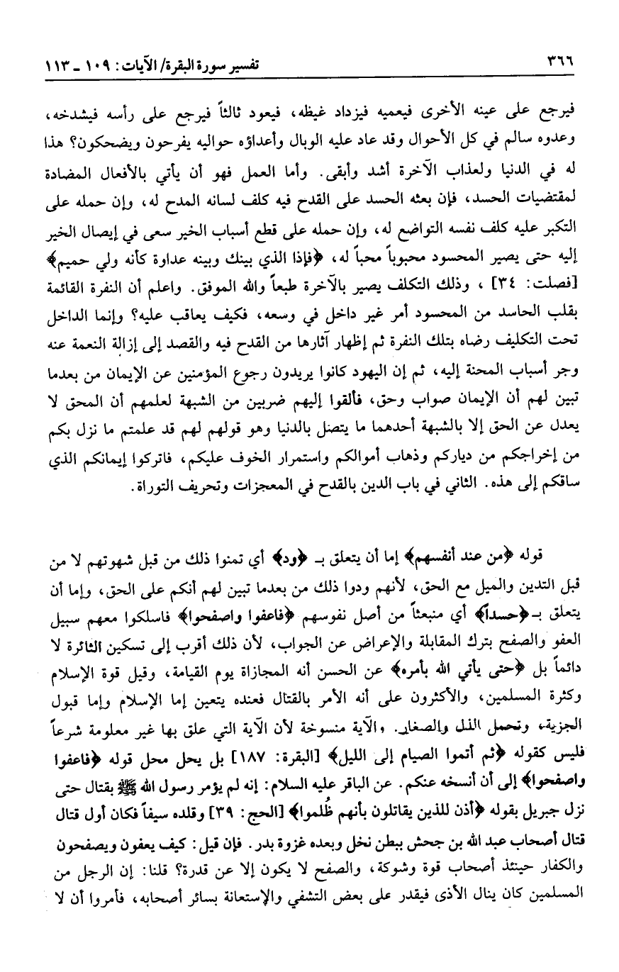 قوله مِنْ عِنْدِ أَنْفُسِهِمْ إما أن يتعلق ب وَدَّ أي تمنوا ذلك من قبل شهوتهم لا من قبل التدين والميل مع الحق، لأنهم ودوا ذلك من بعد ما تبين لهم أنكم على الحق، وإما أن يتعلق ب حَسَداً أي منبعثا من أصل نفوسهم فَاعْفُوا وَاصْفَحُوا فاسلكوا معهم سبيل العفو والصفح بترك المقابلة والإعراض عن الجواب، لأن ذلك أقرب إلى تسكين الثائرة لا دائما بل حَتَّى يَأْتِيَ اللَّهُ بِأَمْرِهِ عن الحسن أنه المجازاة يوم القيامة، وقيل قوة الإسلام وكثرة المسلمين، والأكثرون على أنه الأمر بالقتال فعنده يتعين إما الإسلام وإما قبول الجزية، وتحمل الذل والصغار. والآية منسوخة لأن الآية التي علق بها غير معلومة شرعا فليس كقوله ثُمَّ أَتِمُّوا الصِّيامَ إِلَى اللَّيْلِ [البقرة: 187] بل يحل محل قوله فَاعْفُوا وَاصْفَحُوا إلى أن أنسخه عنكم.