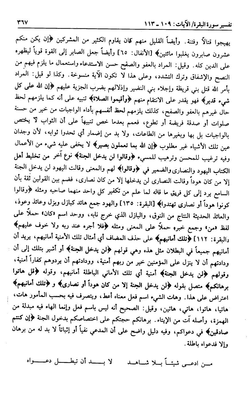 يهيجوا قتالا وفتنة. وأيضا القليل منهم كان يقاوم الكثير من المشركين إِنْ يَكُنْ مِنْكُمْ عِشْرُونَ صابِرُونَ يَغْلِبُوا مِائَتَيْنِ [الأنفال: 65] وأيضا جعل الصابر إلى القوة قويا ليظهره على الدين كله. وقيل: المراد بالعفو والصفح حسن الاستدعاء واستعمال ما يلزم فيهم من النصح والإشفاق وترك التشدد، وعلى هذا لا تكون الآية منسوخة. وكذا لو قيل: المراد بأمر الله قتل بني قريظة وإجلاء بني النضير وإذ لا لهم بضرب الجزية عليهم إِنَّ اللَّهَ عَلى كُلِّ شَيْءٍ قَدِيرٌ فهو يقدر على الانتقام منهم وَأَقِيمُوا الصَّلاةَ تنبيه على أنه كما يلزمهم لحظ حال غيرهم بالعفو والصفح، كذلك يلزمهم لحظ أنفسهم بأداء الواجبات من خير من حسنة صلوات أو صدقة فريضة أو تطوع، فعمم بعد ما خص تنبيها على أن الثواب لا يختص بالواجبات بل بها وبغيرها من الطاعات، ولا بد من إضمار أي تحدوا ثوابه، لأن وجدان عين تلك الأشياء غير مطلوب إِنَّ اللَّهَ بِما تَعْمَلُونَ بَصِيرٌ لا يخفى عليه شيء من الأعمال وفيه ترغيب للمحسن وترهيب للمسيء وَقالُوا لَنْ يَدْخُلَ الْجَنَّةَ نوع آخر من تخليط أهل الكتاب اليهود والنصارى والضمير في وَقالُوا لهم والمعنى وقالت اليهود لن يدخل الجنة إلا من كان هودا وقالت النصارى لن يدخلها إلا من كان نصارى، فضم بين القولين ثقة بأن السامع يرد إلى كل فريق ما قاله لما علم من تكفير كل واحد منهما صاحبه ومثله وَقالُوا كُونُوا هُوداً أَوْ نَصارى تَهْتَدُوا [البقرة: 135] والهود جمع هائد كبازل وبزل وعائذ وعوذ، والعائذ الحديثة النتاج من النوق، والبازل الذي خرج نابه، ووحد اسم «كان» حملا على لفظ «من» وجمع خبره حملا على المعنى ومثله فَلَهُ أَجْرُهُ عِنْدَ رَبِّهِ وَلا خَوْفٌ عَلَيْهِمْ [البقرة: 112] تِلْكَ أَمانِيُّهُمْ على حذف المضاف أي أمثال تلك الأمنية أمانيهم، يريد أن أمانيهم جميعا في البطلان مثل هذه وهي قولهم لَنْ يَدْخُلَ الْجَنَّةَ أو أشير بتلك إلى أن ودادتهم أن لا ينزل على المؤمنين خير من ربهم أمنية، وودادتهم أن يردوهم كفارا أمنية، وقولهم لَنْ يَدْخُلَ الْجَنَّةَ أمنية أي تلك الأماني الباطلة أمانيهم، وقوله قُلْ هاتُوا بُرْهانَكُمْ متصل بقوله لَنْ يَدْخُلَ الْجَنَّةَ إِلَّا مَنْ كانَ هُوداً أَوْ نَصارى وتِلْكَ أَمانِيُّهُمْ اعتراض على هذا. وهات الشيء اسم فعل معناه أعط، ويتصرف فيه بحسب المأمور هات، هاتيا، هاتوا، هاتي، هاتين، وقيل: الصحيح أنه ليس باسم فعل وإنما الهاء فيه مبدلة من الهمزة، وأصله آت من الإيتاء. برهانكم حجتكم على اختصاصكم بدخول الجنة إِنْ كُنْتُمْ صادِقِينَ في دعواكم، وفيه دليل واضح على أن المدعي نفيا أو إثباتا لا بد له من برهان وإلا فدعواه باطلة.