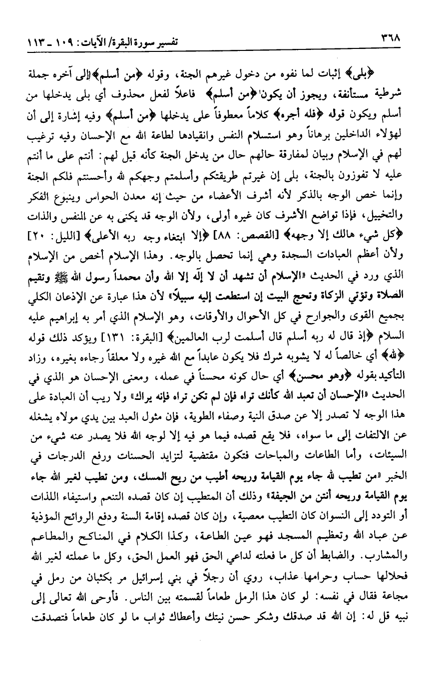 بَلى إثبات لما نفوه من دخول غيرهم الجنة، وقوله مَنْ أَسْلَمَ إلى آخره جملة شرطية مستأنفة، ويجوز أن يكون مَنْ أَسْلَمَ فاعلا لفعل محذوف أي بلى يدخلها من أسلم ويكون قوله فَلَهُ أَجْرُهُ كلاما معطوفا على يدخلها مَنْ أَسْلَمَ وفيه إشارة إلى أن لهؤلاء الداخلين برهانا وهو استسلام النفس وانقيادها لطاعة الله مع الإحسان وفيه ترغيب لهم في الإسلام وبيان لمفارقة حالهم حال من يدخل الجنة كأنه قيل لهم: أنتم على ما أنتم عليه لا تفوزون بالجنة، بلى إن غيرتم طريقتكم وأسلمتم وجهكم لله وأحسنتم فلكم الجنة وإنما خص الوجه بالذكر لأنه أشرف الأعضاء من حيث إنه معدن الحواس وينبوع الفكر والتخييل، فإذا تواضع الأشرف كان غيره أولى، ولأن الوجه قد يكنى به عن النفس والذات كُلُّ شَيْءٍ هالِكٌ إِلَّا وَجْهَهُ [القصص: 88] إِلَّا ابْتِغاءَ وَجْهِ رَبِّهِ الْأَعْلى [الليل: 20] ولأن أعظم العبادات السجدة وهي إنما تحصل بالوجه. وهذا الإسلام أخص من الإسلام الذي