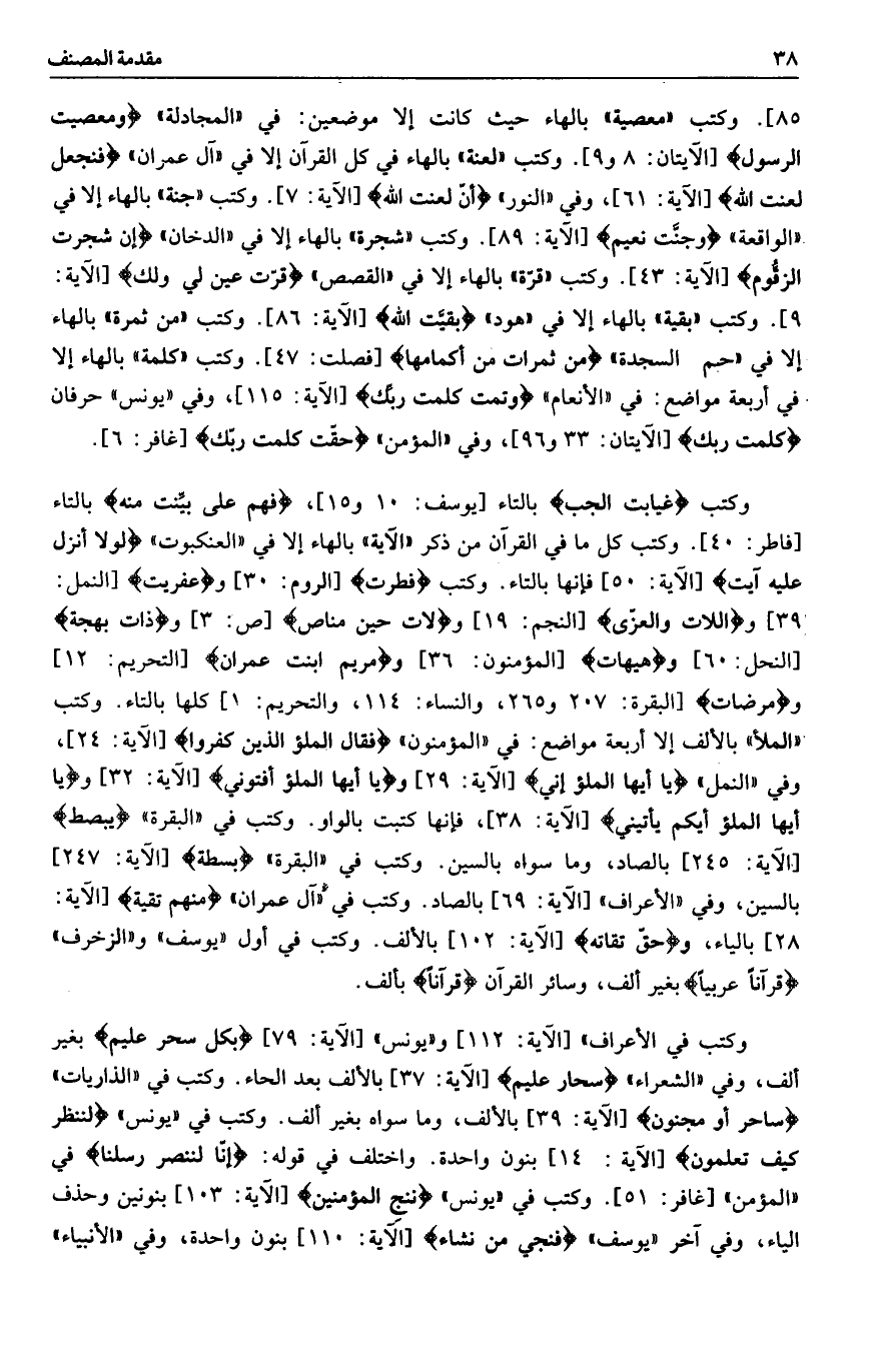 85] . وكتب «معصية» بالهاء حيث كانت إلا موضعين: في «المجادلة» وَمَعْصِيَةِ الرَّسُولِ [الآيتان: 8 و 9] . وكتب «لعنة» بالهاء في كل القرآن إلا في «آل عمران» فَنَجْعَلْ لَعْنَتَ اللَّهِ [الآية: 61] ، وفي «النور» أَنَّ لَعْنَتَ اللَّهِ [الآية: 7] . وكتب «جنة» بالهاء إلا في «الواقعة» وَجَنَّةُ نَعِيمٍ [الآية: 89] . وكتب «شجرة» بالهاء إلا في «الدخان» إِنَّ شَجَرَةَ الزَّقُّومِ [الآية: 43] . وكتب «قرّة» بالهاء إلا في «القصص» قُرَّتُ عَيْنٍ لِي وَلَكَ [الآية: