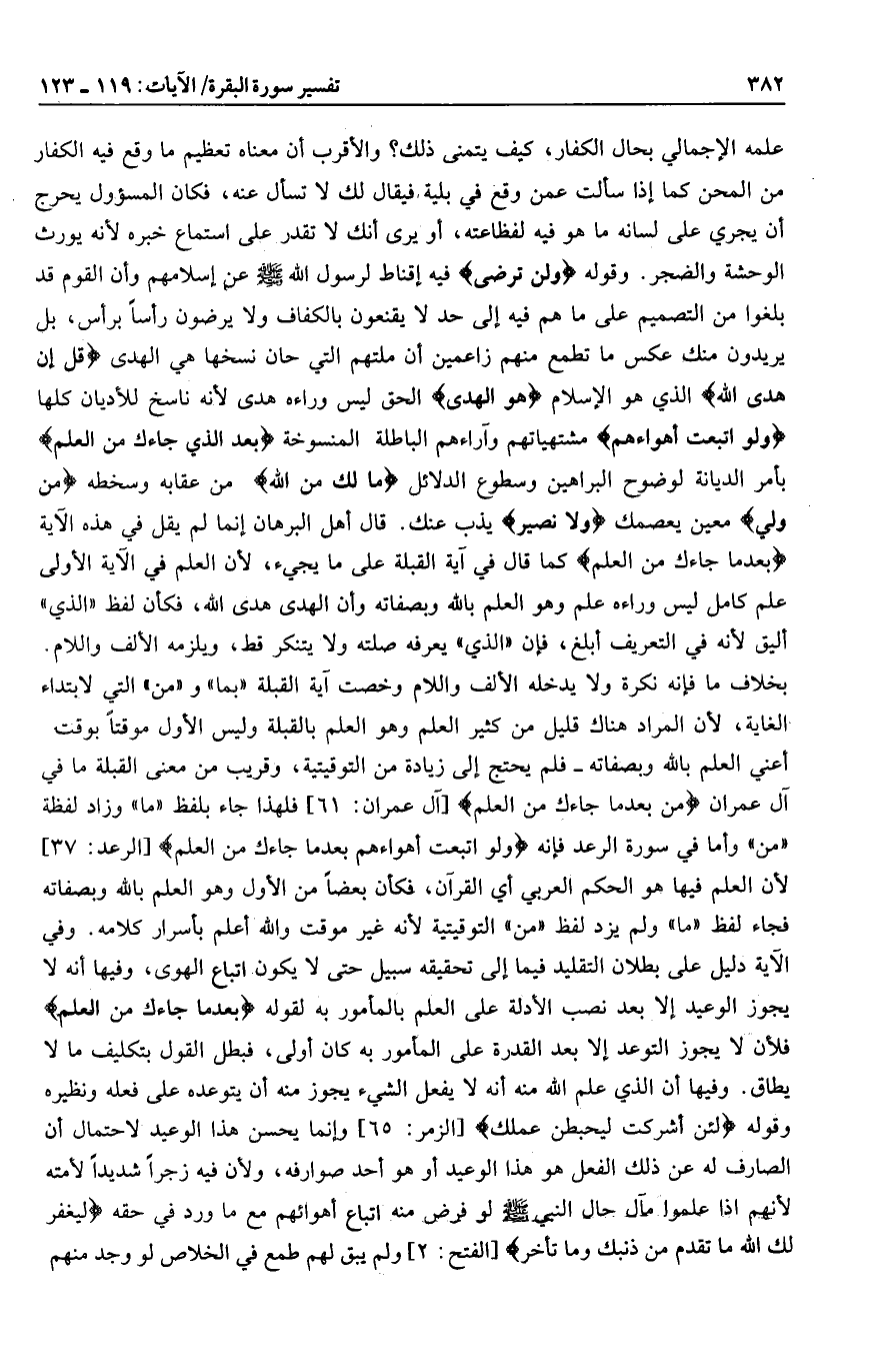 علمه الإجمالي بحال الكفار، كيف يتمنى ذلك؟ والأقرب أن معناه تعظيم ما وقع فيه الكفار من المحن كما إذا سألت عمن وقع في بلية فيقال لك لا تسأل عنه، فكان المسئول يحرج أن يجري على لسانه ما هو فيه لفظاعته، أو يرى أنك لا تقدر على استماع خبره لأنه يورث الوحشة والضجر. وقوله وَلَنْ تَرْضى فيه إقناط لرسول الله صلى الله عليه وسلم عن إسلامهم وأن القوم قد بلغوا من التصميم على ما هم فيه إلى حد لا يقنعون بالكفاف ولا يرضون رأسا برأس، بل يريدون منك عكس ما تطمع منهم زاعمين أن ملتهم التي حان نسخها هي الهدى قُلْ إِنَّ هُدَى اللَّهِ الذي هو الإسلام هُوَ الْهُدى الحق ليس وراءه هدى لأنه ناسخ للأديان كلها وَلَئِنِ اتَّبَعْتَ أَهْواءَهُمْ مشتهياتهم وآراءهم الباطلة المنسوخة بَعْدَ الَّذِي جاءَكَ مِنَ الْعِلْمِ بأمر الديانة لوضوح البراهين وسطوع الدلائل ما لَكَ مِنَ اللَّهِ من عقابه وسخطه مِنْ وَلِيٍّ معين يعصمك وَلا نَصِيرٍ يذب عنك. قال أهل البرهان إنما لم يقل في هذه الآية بَعْدِ ما جاءَكَ مِنَ الْعِلْمِ كما قال في آية القبلة على ما يجيء، لأن العلم في الآية الأولى علم كامل ليس وراءه علم وهو العلم بالله وبصفاته وأن الهدى هدى الله، فكأن لفظ «الذي» أليق لأنه في التعريف أبلغ، فإن «الذي» يعرفه صلته ولا يتنكر قط، ويلزمه الألف واللام.