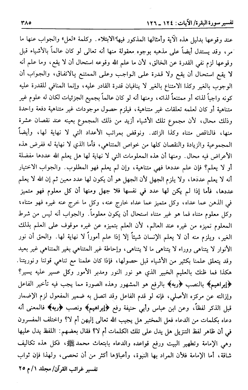 عند وقوعها بدليل هذه الآية وأمثالها المذكور فيها الابتلاء. وكلمة «لعل» والجواب عنها ما مر، وقد يستدل أيضا على مذهبه بوجوه معقولة منها أنه تعالى لو كان عالما بالأشياء قبل وقوعها لزم نفي القدرة عن الخالق، لأن ما علم الله وقوعه استحال أن لا يقع، وما علم أنه لا يقع استحال أن يقع ولا قدرة على الواجب وعلى الممتنع بالاتفاق، والجواب أن الوجوب بالغير وكذا الامتناع بالغير لا ينافيان قدرة القادر عليه، وإنما المنافي للقدرة عليه كونه واجبا لذاته أو ممتنعا لذاته، ومنها أنه لو كان عالما بجميع الجزئيات لكان له علوم غير متناهية أو كان لعلمه تعلقات غير متناهية، فيلزم حصول موجودات غير متناهية دفعة واحدة وذلك محال، لأن مجموع تلك الأشياء أزيد من ذلك المجموع بعينه عند نقصان عشرة منها، فالناقص متناه وكذا الزائد. ونوقض بمراتب الأعداد التي لا نهاية لها، وأيضا المجموعية والزيادة والنقصان كلها من خواص المتناهي، فأما الذي لا نهاية له ففرض هذه الأعراض فيه محال. ومنها أن هذه المعلومات التي لا نهاية لها هل يعلم الله عددها مفضلة أو لا يعلم؟ فإن علم عددها فهي متناهية، وإن لم يعلم فهو المطلوب. والجواب الاختيار أنه لا يعلم عددها، ولا يلزم الجهل لأن الجهل هو أن يكون لها عدد معين ثم إن الله لا يعلم عددها، فأما إذا لم يكن لها عدد في نفسها فلا جهل ومنها أن كل معلوم فهو متميز في الذهن عما عداه، وكل متميز عما عداه خارج عنه، وكل ما خرج عنه غيره فهو متناه، وكل معلوم متناه فما هو غير متناه استحال أن يكون معلوما. والجواب أنه ليس من شرط المعلوم تميزه من غيره عند العالم، لأن العلم بتميزه عن غيره موقوف على العلم بذلك الغير، ويلزم منه أن لا يعلم الإنسان شيئا إلا إذا علم أمورا لا نهاية لها. والحق أن نور الأنوار لا يتناهى ووراء لا يتناهى ما لا يتناهى، وإحاطة غير المتناهي بغير المتناهي غير بعيد وقد يتعلق علمنا بكثير من الأشياء قبل حصولها، فإذا كان علمنا مع تناهي قوتنا ونوريتنا.