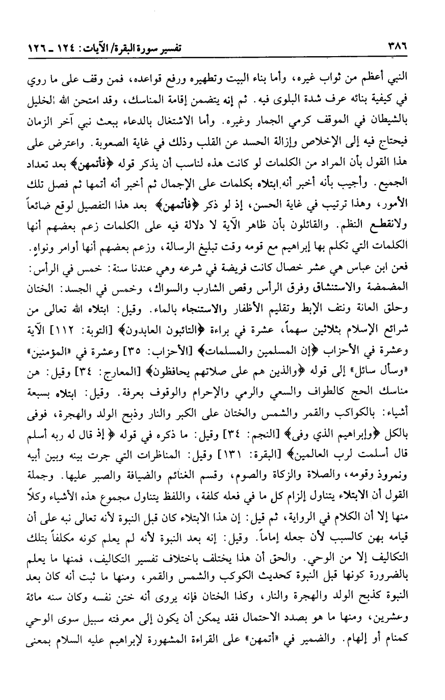 النبي أعظم من ثواب غيره، وأما بناء البيت وتطهيره ورفع قواعده، فمن وقف على ما روي في كيفية بنائه عرف شدة البلوى فيه. ثم إنه يتضمن إقامة المناسك، وقد امتحن الله الخليل بالشيطان في الموقف كرمي الجمار وغيره. وأما الاشتغال بالدعاء ببعث نبي آخر الزمان فيحتاج فيه إلى الإخلاص وإزالة الحسد عن القلب وذلك في غاية الصعوبة. واعترض على هذا القول بأن المراد من الكلمات لو كانت هذه لناسب أن يذكر قوله فَأَتَمَّهُنَّ بعد تعداد الجميع. وأجيب بأنه أخبر أنه ابتلاه بكلمات على الإجمال ثم أخبر أنه أتمها ثم فصل تلك الأمور، وهذا ترتيب في غاية الحسن، إذ لو ذكر فَأَتَمَّهُنَّ بعد هذا التفصيل لوقع ضائعا ولا نقطع النظم. والقائلون بأن ظاهر الآية لا دلالة فيه على الكلمات زعم بعضهم أنها الكلمات التي تكلم بها إبراهيم مع قومه وقت تبليغ الرسالة، وزعم بعضهم أنها أوامر ونواه.