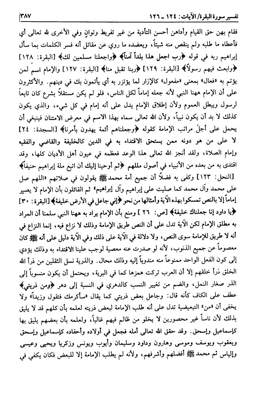 ثم القائلون بأن الإمام لا يصير إماما إلا بالنص تمسكوا بهذه الآية وأمثالها من نحو إِنِّي جاعِلٌ فِي الْأَرْضِ خَلِيفَةً [البقرة: 30] يا داوُدُ إِنَّا جَعَلْناكَ خَلِيفَةً [ص: 26] ومنع بأن الإمام يراد به هاهنا النبي سلمنا أن المراد به مطلق الإمام لكن الآية تدل على أن النص طريق الإمامة وذلك لا نزاع فيه، إنما النزاع في أنه لا طريق للإمامة سوى النص، ولا دلالة في الآية على ذلك وفي الآية دليل على أنه صلى الله عليه وسلم كان معصوما عن جميع الذنوب، لأنه لو صدرت عنه معصية لوجب علينا الاقتداء به وذلك يؤدي إلى كون الفعل الواحد ممنوعا منه مندوبا إليه وذلك محال. والذرية نسل الثقلين من ذرأ الله الخلق ذرأ خلقهم إلا أن العرب تركت همزها كما في البرية، ويحتمل أن يكون منسوبا إلى الذر صغار النمل، والضم من تغيير النسب كالدهري في النسبة إلى دهر وَمِنْ ذُرِّيَّتِي عطف على الكاف كأنه قال: وجاعل بعض ذريتي كما يقال «سأكرمك فتقول وزيدا» ولا يخفى أن «من» التبعيضية تدل على أنه طلب الإمامة لبعض ذريته لعلمه بأن كلهم قد لا يليق بذلك لأن ناسا غير محصورين لا يخلو من ظالم فيهم غالبا، ولعلمه بأن بعضهم يليق بها كإسماعيل وإسحق. وقد حقق الله تعالى أمله فجعل في أولاده وأحفاده كإسماعيل وإسحق ويعقوب ويوسف وموسى وهارون وداود وسليمان وأيوب ويونس وزكريا ويحيى وعيسى وإلياس ثم محمد صلى الله عليه وسلم أفضلهم وأشرفهم، ولأنه لم يطلب الإمامة إلا للبعض فكان يكفي في