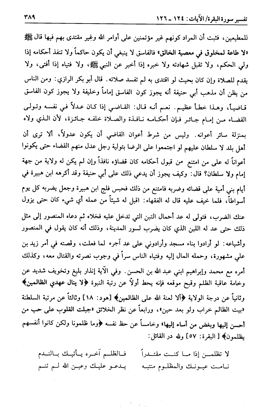 فالفاسق لا ينبغي أن يكون حاكما ولا تنفذ أحكامه إذا ولي الحكم، ولا تقبل شهادته ولا خبره إذا أخبر عن النبي صلى الله عليه وسلم، ولا فتياه إذا أفتى، ولا يقدم للصلاة وإن كان بحيث لو اقتدى به لم تفسد صلاته. قال أبو بكر الرازي: ومن الناس من يظن أن مذهب أبي حنيفة أنه يجوز كون الفاسق إماما وخليفة ولا يجوز كون الفاسق قاضيا، وهذا خطأ عظيم. نعم أنه قال: القاضي إذا كان عدلا في نفسه وتولى القضاء من إمام جائر فإن أحكامه نافذة والصلاة خلفه جائزة، لأن الذي ولاه بمنزلة سائر أعوانه. وليس من شرط أعوان القاضي أن يكون عدولا، ألا ترى أن أهل بلد لا سلطان عليهم لو اجتمعوا على الرضا بتولية رجل عدل منهم القضاء حتى يكونوا أعوانا له على من امتنع من قبول أحكامه كان قضاؤه نافذا وإن لم يكن له ولاية من جهة إمام ولا سلطان؟ قال: وكيف يجوز أن يدعي ذلك على أبي حنيفة وقد أكرهه ابن هبيرة في أيام بني أمية على قضائه وضربه فامتنع من ذلك فحبس فلج ابن هبيرة وجعل يضربه كل يوم أسواطا، فلما خيف عليه قال له الفقهاء: اقبل له شيئا من عمله أي شيء كان حتى يزول عنك الضرب، فتولى له عد أحمال التبن التي تدخل عليه فخلاه ثم دعاه المنصور إلى مثل ذلك حتى عد له اللبن الذي كان يضرب لسور المدينة، وذلك أنه كان يقول في المنصور وأشياعه: لو أرادوا بناء مسجد وأرادوني على عد آجره لما فعلت، وقصته في أمر زيد بن علي مشهورة، وحمله المال إليه وفتياه الناس سرا في وجوب نصرته والقتال معه، وكذلك أمره مع محمد وإبراهيم ابني عبد الله بن الحسن. وفي الآية إنذار بليغ وتخويف شديد عن وخامة عاقبة الظلم وقبح موقعه فإنه يحط أولا عن رتبة النبوة لا يَنالُ عَهْدِي الظَّالِمِينَ وثانيا عن درجة الولاية أَلا لَعْنَةُ اللَّهِ عَلَى الظَّالِمِينَ [هود: 18] وثالثا عن مرتبة السلطنة «بيت الظالم خراب ولو بعد حين» ، ورابعا عن نظر الخلائق