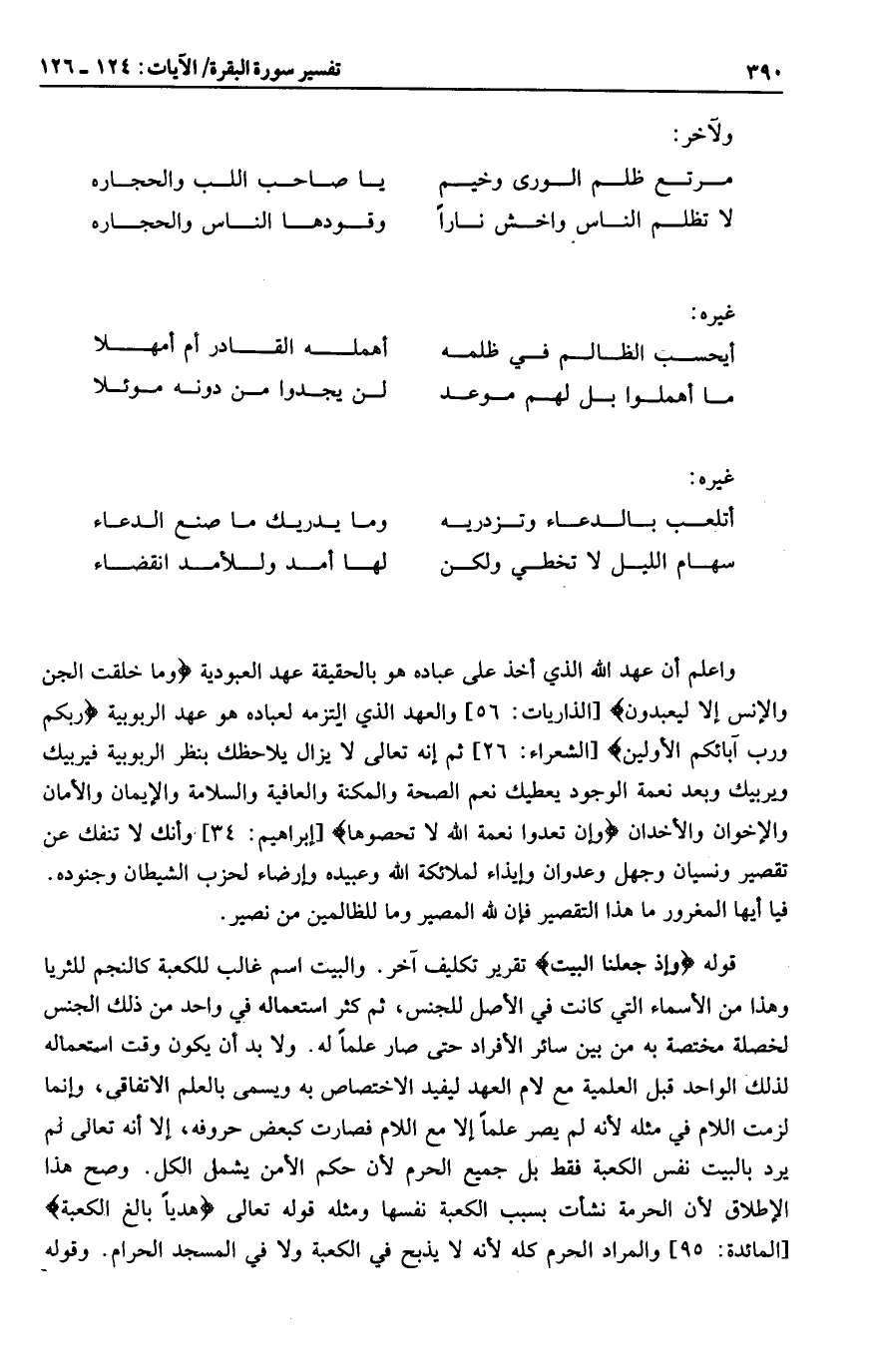 قوله وَإِذْ جَعَلْنَا الْبَيْتَ تقرير تكليف آخر. والبيت اسم غالب للكعبة كالنجم للثريا وهذا من الأسماء التي كانت في الأصل للجنس، ثم كثر استعماله في واحد من ذلك الجنس لخصلة مختصة به من بين سائر الأفراد حتى صار علما له. ولا بد أن يكون وقت استعماله لذلك الواحد قبل العلمية مع لام العهد ليفيد الاختصاص به ويسمى بالعلم الاتفاقي، وإنما لزمت اللام في مثله لأنه لم يصر علما إلا مع اللام فصارت كبعض حروفه، إلا أنه تعالى لم يرد بالبيت نفس الكعبة فقط بل جميع الحرم لأن حكم الأمن يشمل الكل. وصح هذا الإطلاق لأن الحرمة نشأت بسبب الكعبة نفسها ومثله قوله تعالى هَدْياً بالِغَ الْكَعْبَةِ [المائدة: 95] والمراد الحرم كله لأنه لا يذبح في الكعبة ولا في المسجد الحرام. وقوله