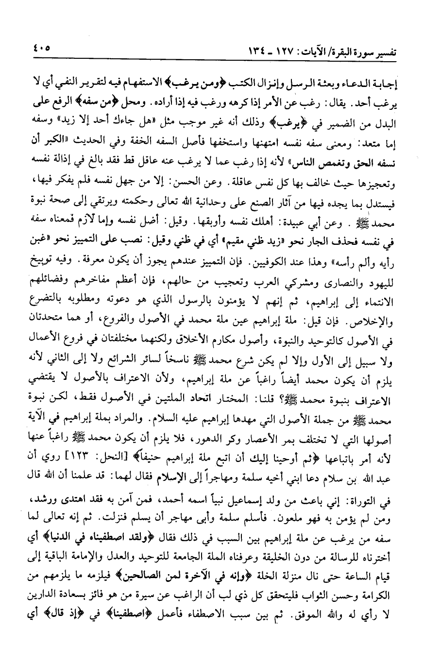 لأنه إذا رغب عما لا يرغب عنه عاقل قط فقد بالغ في إذالة نفسه وتعجيزها حيث خالف بها كل نفس عاقلة. وعن الحسن: إلا من جهل نفسه فلم يفكر فيها، فيستدل بما يجده فيها من آثار الصنع على وحدانية الله تعالى وحكمته ويرتقي إلى صحة نبوة محمد صلى الله عليه وسلم. وعن أبي عبيدة: أهلك نفسه وأوبقها. وقيل: أضل نفسه وإما لازم فمعناه سفه في نفسه فحذف الجار نحو «زيد ظني مقيم» أي في ظني وقيل: نصب على التمييز نحو «غبن رأيه وألم رأسه» وهذا عند الكوفيين. فإن التمييز عندهم يجوز أن يكون معرفة. وفيه توبيخ لليهود والنصارى ومشركي العرب وتعجيب من حالهم، فإن أعظم مفاخرهم وفضائلهم الانتماء إلى إبراهيم، ثم إنهم لا يؤمنون بالرسول الذي هو دعوته ومطلوبه بالتضرع والإخلاص. فإن قيل: ملة إبراهيم عين ملة محمد في الأصول والفروع، أو هما متحدتان في الأصول كالتوحيد والنبوة، وأصول مكارم الأخلاق ولكنهما مختلفتان في فروع الأعمال ولا سبيل إلى الأول وإلا لم يكن شرع محمد صلى الله عليه وسلم ناسخا لسائر الشرائع ولا إلى الثاني لأنه يلزم أن يكون محمد أيضا راغبا عن ملة إبراهيم، ولأن الاعتراف بالأصول لا يقتضي الاعتراف بنبوة محمد صلى الله عليه وسلم؟ قلنا: المختار اتحاد الملتين في الأصول فقط، لكن نبوة محمد صلى الله عليه وسلم من جملة الأصول التي مهدها إبراهيم عليه السلام. والمراد بملة إبراهيم في الآية أصولها التي لا تختلف بمر الأعصار وكر الدهور، فلا يلزم أن يكون محمد صلى الله عليه وسلم راغبا عنها لأنه أمر باتباعها ثُمَّ أَوْحَيْنا إِلَيْكَ أَنِ اتَّبِعْ مِلَّةَ إِبْراهِيمَ حَنِيفاً [النحل: 123] روي أن عبد الله بن سلام دعا ابني أخيه سلمة ومهاجرا إلى الإسلام فقال لهما: قد علمنا أن الله قال في التوراة: إني باعث من ولد إسماعيل نبيا اسمه أحمد، فمن آمن به فقد اهتدى ورشد، ومن لم يؤمن به فهو ملعون. فأسلم سلمة وأبى مهاجر أن يسلم فنزلت. ثم إنه تعالى لما سفه من يرغب عن ملة إبراهيم بين السبب في ذلك فقال وَلَقَدِ اصْطَفَيْناهُ فِي الدُّنْيا أي اخترناه للرسالة من دون الخليفة وعرفناه الملة الجامعة للتوحيد والعدل والإمامة الباقية إلى قيام الساعة حتى نال منزلة الخلة وَإِنَّهُ فِي الْآخِرَةِ لَمِنَ الصَّالِحِينَ فيلزمه ما يلزمهم من الكرامة وحسن الثواب فليتحقق كل ذي لب أن الراغب عن سيرة من هو فائز بسعادة الدارين لا رأي له والله الموفق. ثم بين سبب الاصطفاء فأعمل اصْطَفَيْناهُ في إِذْ قالَ أي