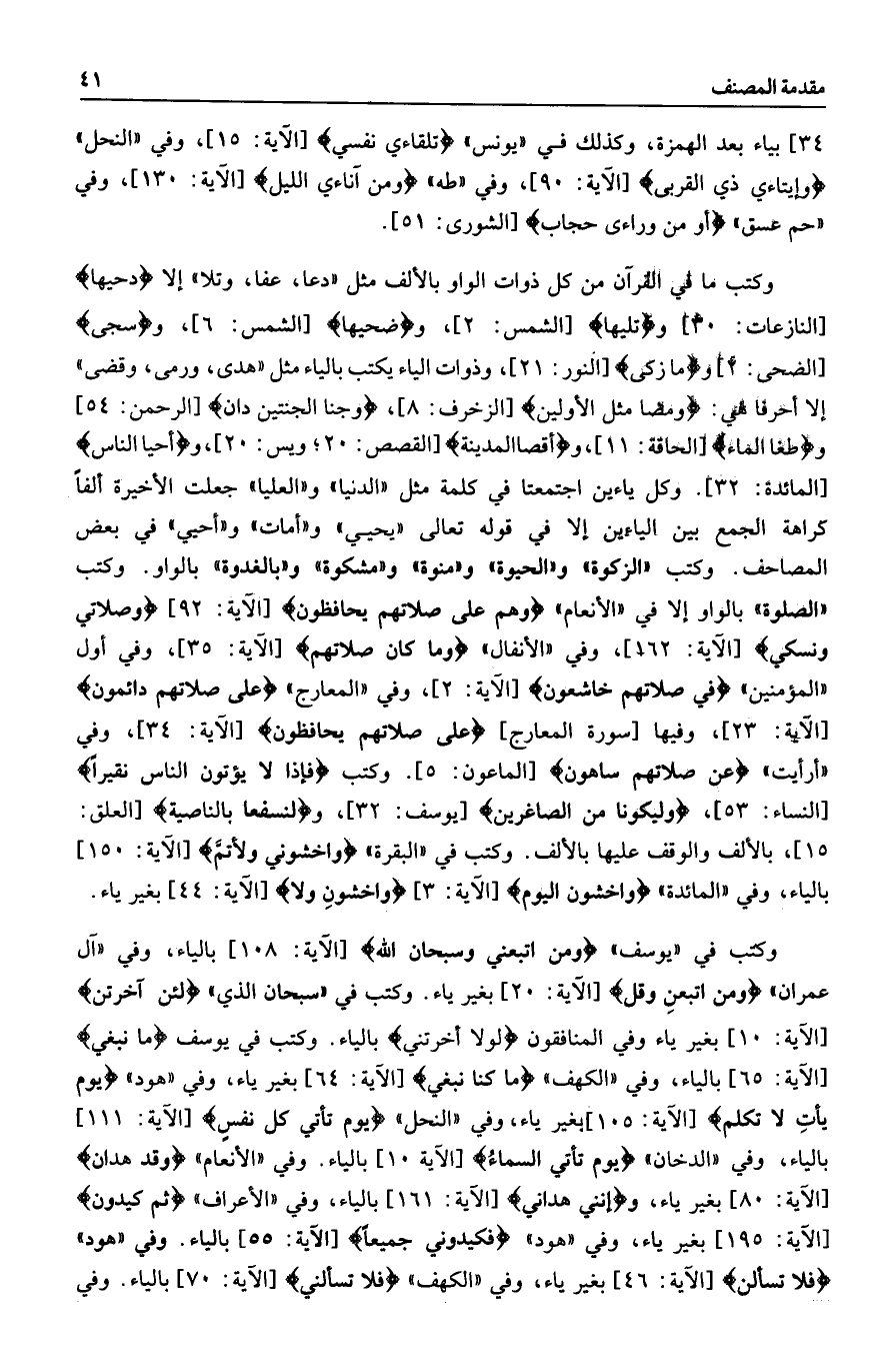 وكتب ما في القرآن من كل ذوات الواو بالألف مثل «دعا، عفا، وتلا» إلا دَحاها [النازعات: 30] وتَلاها [الشمس: 2] ، وضُحاها [الشمس: 6] ، وسَجى [الضحى: 2] وما زَكى [النور: 21] ، وذوات الياء يكتب بالياء مثل «هدى، ورمى، وقضى» إلا أحرفا هي: وَمَضى مَثَلُ الْأَوَّلِينَ [الزخرف: 8] ، وَجَنَى الْجَنَّتَيْنِ دانٍ [الرحمن: 54] وطَغَى الْماءُ [الحاقة: 11] ، وأَقْصَا الْمَدِينَةِ [القصص: 20 ويس: 20] ، وأَحْيَا النَّاسَ [المائدة: 32] . وكل ياءين اجتمعتا في كلمة مثل «الدنيا» و «العليا» جعلت الأخيرة ألفا كراهة الجمع بين الياءين إلا في قوله تعالى «يحيي» و «أمات» و «أحيي» في بعض المصاحف. وكتب «الزكوة» و «الحيوة» و «منوة» و «مشكوة» و «بالغدوة» بالواو. وكتب «الصلاة» بالواو إلا في «الأنعام» وَهُمْ عَلى صَلاتِهِمْ يُحافِظُونَ [الآية: 92] إِنَّ صَلاتِي وَنُسُكِي [الآية: 162] ، وفي «الأنفال» وَما كانَ صَلاتُهُمْ [الآية: 35] ، وفي أول «المؤمنين» فِي صَلاتِهِمْ خاشِعُونَ [الآية: 2] ، وفي «المعارج» عَلى صَلاتِهِمْ دائِمُونَ [الآية: 23] ، وفيها [سورة المعارج] عَلى صَلاتِهِمْ يُحافِظُونَ [الآية: 34] ، وفي «أرأيت» عَنْ صَلاتِهِمْ ساهُونَ [الماعون: 5] . وكتب فَإِذاً لا يُؤْتُونَ النَّاسَ نَقِيراً [النساء: 53] ، وَلَيَكُوناً مِنَ الصَّاغِرِينَ [يوسف: 32] ، ولَنَسْفَعاً بِالنَّاصِيَةِ [العلق: