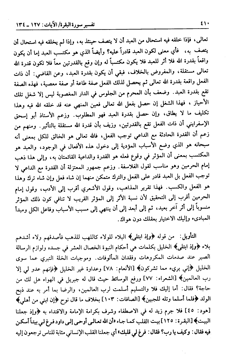 من قوله وَإِذِ ابْتَلى البلاء للولاء كاللهب للذهب فأصدقهم ولاء أشدهم بلاء وَإِذِ ابْتَلى الخليل بكلمات هي أحكام النبوة الخصال العشر في جسده ولوازم الرسالة الصبر عند صدمات المكروهات وفقدان المألوفات. وموجبات الخلة التبري عما سوى الخليل إِنِّي بَرِيءٌ مِمَّا تُشْرِكُونَ [الأنعام: 78] وعداوة غير الخليل فَإِنَّهُمْ عَدُوٌّ لِي إِلَّا رَبَّ الْعالَمِينَ [الشعراء: 77] ورفع الوسائط حيث قال له جبريل في الهواء هل لك من حاجة؟ فقال: أما إليك فلا والتسليم أسلمت لرب العالمين، والرضا بما أمر به عند ذبح الولد فَلَمَّا أَسْلَما وَتَلَّهُ لِلْجَبِينِ [الصافات: 103] بخلاف ما قال نوح إِنَّ ابْنِي مِنْ أَهْلِي [هود: 45] فلا جرم زيد له في الاصطفاء وشرف بكرامة الإمامة والاقتداء به وَإِذْ جَعَلْنَا الْبَيْتَ [البقرة: 125] بيت القلب كما