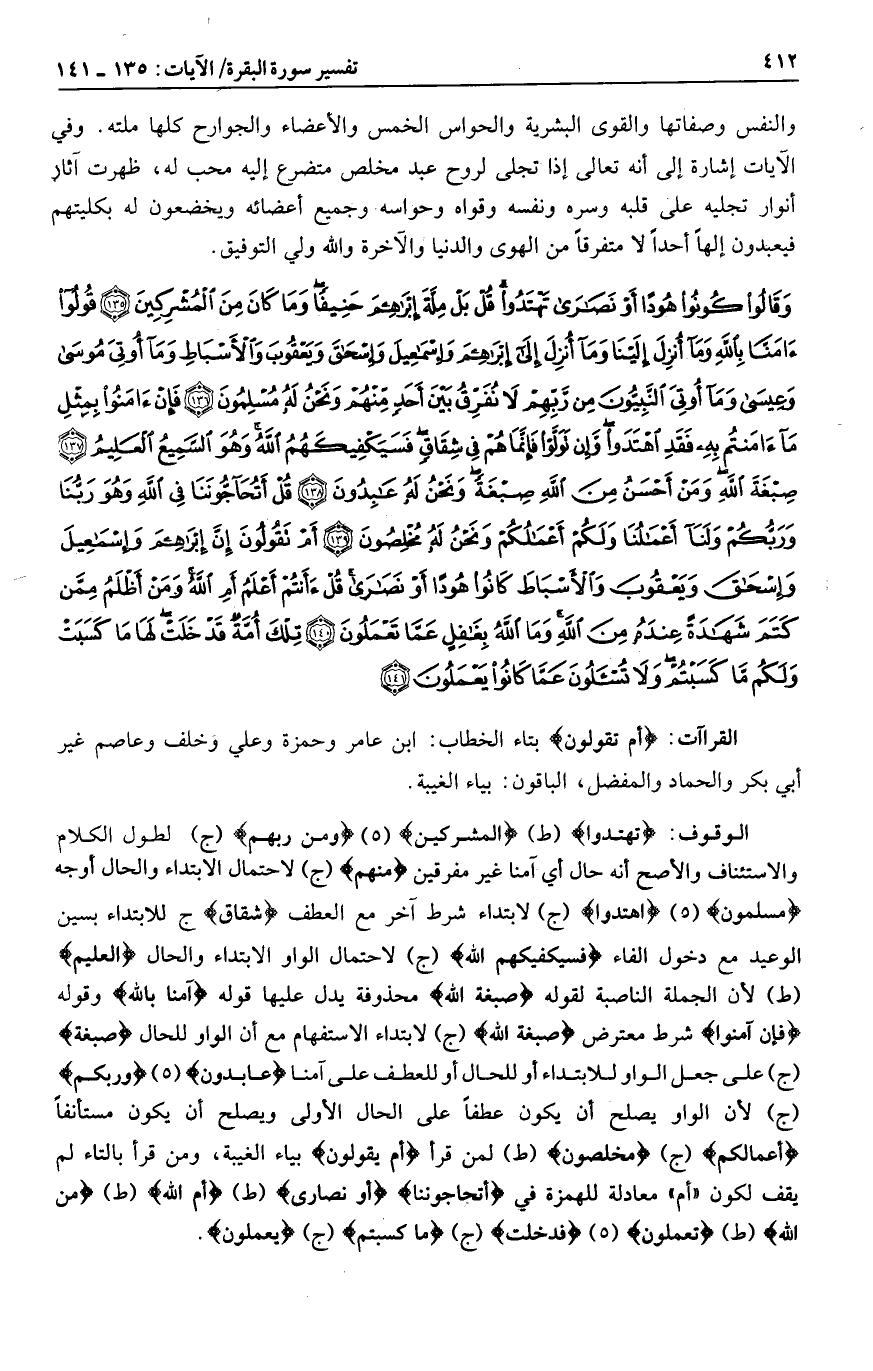 تَهْتَدُوا (ط) الْمُشْرِكِينَ (هـ) ومِنْ رَبِّهِمْ (ج) لطول الكلام والاستئناف والأصح أنه حال أي آمنا غير مفرقين مِنْهُمْ (ج) لاحتمال الابتداء والحال أوجه مُسْلِمُونَ (هـ) اهْتَدَوْا (ج) لابتداء شرط آخر مع العطف شِقاقٍ ج للابتداء بسين الوعيد مع دخول الفاء فَسَيَكْفِيكَهُمُ اللَّهُ (ج) لاحتمال الواو الابتداء والحال الْعَلِيمُ (ط) لأن الجملة الناصبة لقوله صِبْغَةَ اللَّهِ محذوفة يدل عليها قوله آمَنَّا بِاللَّهِ وقوله فَإِنْ آمَنُوا شرط معترض صِبْغَةَ اللَّهِ (ج) لابتداء الاستفهام مع أن الواو للحال صِبْغَةَ (ج) على جعل الواو للابتداء أو للحال أو للعطف على آمنا عابِدُونَ (هـ) وَرَبُّكُمْ (ج) لأن الواو يصلح أن يكون عطفا على الحال الأولى ويصلح أن يكون مستأنفا أَعْمالُكُمْ (ج) مُخْلِصُونَ (ط) لمن قرأ أم يقولون بياء الغيبة، ومن قرأ بالتاء لم يقف لكون «أم» معادلة للهمزة في أَتُحَاجُّونَنا أَوْ نَصارى (ط) أَمِ اللَّهُ (ط) مِنَ اللَّهِ (ط) تَعْمَلُونَ (هـ) قَدْ خَلَتْ (ج) ما كَسَبْتُمْ (ج) يَعْمَلُونَ.