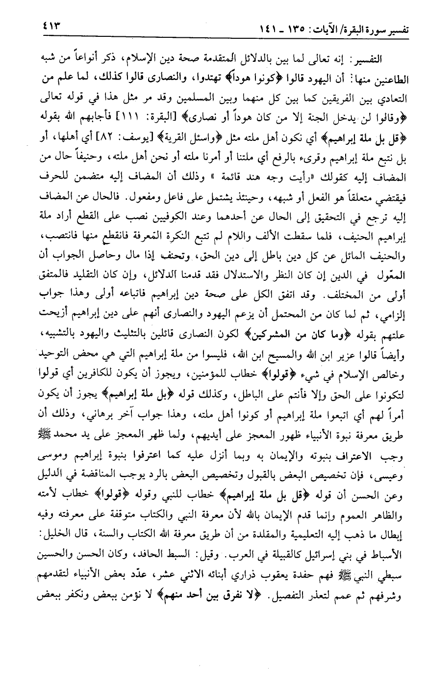 إنه تعالى لما بين بالدلائل المتقدمة صحة دين الإسلام، ذكر أنواعا من شبه الطاعنين منها: أن اليهود قالوا كُونُوا هُوداً تهتدوا، والنصارى قالوا كذلك، لما علم من التعادي بين الفريقين كما بين كل منهما وبين المسلمين وقد مر مثل هذا في قوله تعالى وَقالُوا لَنْ يَدْخُلَ الْجَنَّةَ إِلَّا مَنْ كانَ هُوداً أَوْ نَصارى [البقرة: 111] فأجابهم الله بقوله قُلْ بَلْ مِلَّةَ إِبْراهِيمَ أي نكون أهل ملته مثل وَسْئَلِ الْقَرْيَةَ [يوسف: 82] أي أهلها، أو بل نتبع ملة إبراهيم وقرىء بالرفع أي ملتنا أو أمرنا ملته أو نحن أهل ملته، وحنيفا حال من المضاف إليه كقولك «رأيت وجه هند قائمة» وذلك أن المضاف إليه متضمن للحرف فيقتضي متعلقا هو الفعل أو شبهه، وحينئذ يشتمل على فاعل ومفعول. فالحال عن المضاف إليه ترجع في التحقيق إلى الحال عن أحدهما وعند الكوفيين نصب على القطع أراد ملة إبراهيم الحنيف، فلما سقطت الألف واللام لم تتبع النكرة المعرفة فانقطع منها فانتصب، والحنيف المائل عن كل دين باطل إلى دين الحق، وتحنف إذا مال وحاصل الجواب أن المعوّل في الدين إن كان النظر والاستدلال فقد قدمنا الدلائل، وإن كان التقليد فالمتفق أولى من المختلف. وقد اتفق الكل على صحة دين إبراهيم فاتباعه أولى وهذا جواب إلزامي، ثم لما كان من المحتمل أن يزعم اليهود والنصارى أنهم على دين إبراهيم أزيحت علتهم بقوله وَما كانَ مِنَ الْمُشْرِكِينَ لكون النصارى قائلين بالتثليث واليهود بالتشبيه، وأيضا قالوا عزير ابن الله والمسيح ابن الله، فليسوا من ملة إبراهيم التي هي محض التوحيد وخالص الإسلام في شيء قُولُوا خطاب للمؤمنين، ويجوز أن يكون للكافرين أي قولوا لتكونوا على الحق وإلا فأنتم على الباطل، وكذلك قوله بَلْ مِلَّةَ إِبْراهِيمَ يجوز أن يكون أمرا لهم أي اتبعوا ملة إبراهيم أو كونوا أهل ملته، وهذا جواب آخر برهاني، وذلك أن طريق معرفة نبوة الأنبياء ظهور المعجز على أيديهم، ولما ظهر المعجز على يد محمد صلى الله عليه وسلم وجب الاعتراف بنبوته والإيمان به وبما أنزل عليه كما اعترفوا بنبوة إبراهيم وموسى وعيسى، فإن تخصيص البعض بالقبول وتخصيص البعض بالرد يوجب المناقضة في الدليل وعن الحسن أن قوله قُلْ بَلْ مِلَّةَ إِبْراهِيمَ خطاب للنبي وقوله قُولُوا خطاب لأمته والظاهر العموم وإنما قدم الإيمان بالله لأن معرفة النبي والكتاب متوفقة على معرفته وفيه إبطال ما ذهب إليه التعليمية والمقلدة من أن طريق معرفة الله الكتاب والسنة، قال الخليل:
