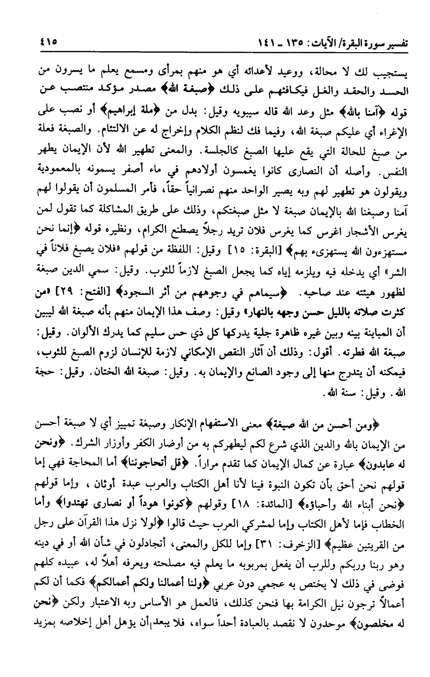 وَمَنْ أَحْسَنُ مِنَ اللَّهِ صِبْغَةً معنى الاستفهام الإنكار وصبغة تمييز أي لا صبغة أحسن من الإيمان بالله والدين الذي شرع لكم ليطهركم به من أوضار الكفر وأوزار الشرك. وَنَحْنُ لَهُ عابِدُونَ عبارة عن كمال الإيمان كما تقدم مرارا. قُلْ أَتُحَاجُّونَنا أما المحاجة فهي إما قولهم نحن أحق بأن تكون النبوة فينا لأنا أهل الكتاب والعرب عبدة أوثان، وإما قولهم نَحْنُ أَبْناءُ اللَّهِ وَأَحِبَّاؤُهُ [المائدة: 18] وقولهم كُونُوا هُوداً أَوْ نَصارى تَهْتَدُوا وأما الخطاب فإما لأهل الكتاب وإما لمشركي العرب حيث قالوا لَوْلا نُزِّلَ هذَا الْقُرْآنُ عَلى رَجُلٍ مِنَ الْقَرْيَتَيْنِ عَظِيمٍ [الزخرف: 31] وإما للكل والمعنى، أتجادلون في شأن الله أو في دينه وهو ربنا وربكم وللرب أن يفعل بمربوبه ما يعلم فيه مصلحته ويعرفه أهلا له، عبيده كلهم فوضى في ذلك لا يختص به عجمي دون عربي وَلَنا أَعْمالُنا وَلَكُمْ أَعْمالُكُمْ فكما أن لكم أعمالا ترجون نيل الكرامة بها فنحن كذلك، فالعمل هو الأساس وبه الاعتبار ولكن نَحْنُ لَهُ مُخْلِصُونَ موحدون لا نقصد بالعبادة أحدا سواه، فلا يبعد أن يؤهل أهل إخلاصه بمزيد