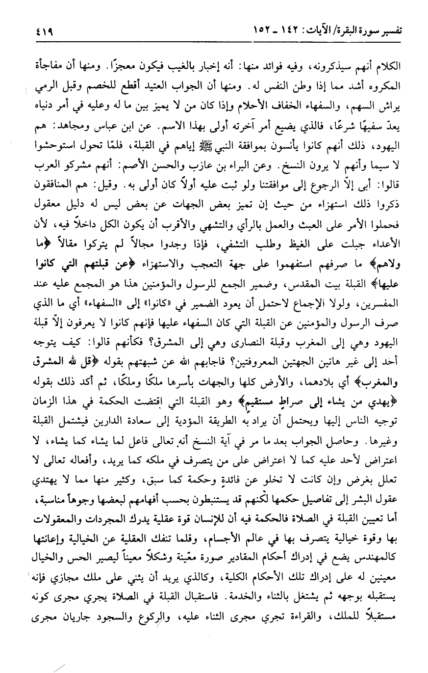 الكلام أنهم سيذكرونه، وفيه فوائد منها: أنه إخبار بالغيب فيكون معجزا. ومنها أن مفاجأة المكروه أشد مما إذا وطن النفس له. ومنها أن الجواب العتيد أقطع للخصم وقبل الرمي يراش السهم، والسفهاء الخفاف الأحلام وإذا كان من لا يميز بين ما له وعليه في أمر دنياه يعدّ سفيها شرعا، فالذي يضيع أمر آخرته أولى بهذا الاسم. عن ابن عباس ومجاهد: هم اليهود، ذلك أنهم كانوا يأنسون بموافقة النبي صلى الله عليه وسلم إياهم في القبلة، فلمّا تحول استوحشوا لا سيما وأنهم لا يرون النسخ. وعن البراء بن عازب والحسن الأصم: أنهم مشركو العرب قالوا: أبى إلّا الرجوع إلى موافقتنا ولو ثبت عليه أولا كان أولى به. وقيل: هم المنافقون ذكروا ذلك استهزاء من حيث إن تميز بعض الجهات عن بعض ليس له دليل معقول فحملوا الأمر على العبث والعمل بالرأي والتشهي والأقرب أن يكون الكل داخلا فيه، لأن الأعداء جبلت على الغيظ وطلب التشفي، فإذا وجدوا مجالا لم يتركوا مقالا ما وَلَّاهُمْ ما صرفهم استفهموا على جهة التعجب والاستهزاء عَنْ قِبْلَتِهِمُ الَّتِي كانُوا عَلَيْها القبلة بيت المقدس، وضمير الجمع للرسول والمؤمنين هذا هو المجمع عليه عند المفسرين، ولولا الإجماع لاحتمل أن يعود الضمير في «كانوا» إلى «السفهاء» أي ما الذي صرف الرسول والمؤمنين عن القبلة التي كان السفهاء عليها فإنهم كانوا لا يعرفون إلّا قبلة اليهود وهي إلى المغرب وقبلة النصارى وهي إلى المشرق؟ فكأنهم قالوا: كيف يتوجه أحد إلى غير هاتين الجهتين المعروفتين؟ فاجابهم الله عن شبهتهم بقوله قُلْ لِلَّهِ الْمَشْرِقُ وَالْمَغْرِبُ أي بلادهما، والأرض كلها والجهات بأسرها ملكا وملكا، ثم أكد ذلك بقوله يَهْدِي مَنْ يَشاءُ إِلى صِراطٍ مُسْتَقِيمٍ وهو القبلة التي اقتضت الحكمة في هذا الزمان توجيه الناس إليها ويحتمل أن يراد به الطريقة المؤدية إلى سعادة الدارين فيشتمل القبلة وغيرها. وحاصل الجواب بعد ما مر في آية النسخ أنه تعالى فاعل لما يشاء كما يشاء، لا اعتراض لأحد عليه كما لا اعتراض على من يتصرف في ملكه كما يريد، وأفعاله تعالى لا تعلل بغرض وإن كانت لا تخلو عن فائدة وحكمة كما سبق، وكثير منها مما لا يهتدي عقول البشر إلى تفاصيل حكمها لكنهم قد يستنبطون بحسب أفهامهم لبعضها وجوها مناسبة، أما تعيين القبلة في الصلاة فالحكمة فيه أن للإنسان قوة عقلية يدرك المجردات والمعقولات بها وقوة خيالية يتصرف بها في عالم الأجسام، وقلما تنفك العقلية عن الخيالية وإعانتها كالمهندس يضع في إدراك أحكام المقادير صورة معيّنة وشكلا معينا ليصير الحس والخيال معينين له على إدراك تلك الأحكام الكلية، وكالذي يريد أن يثني على ملك مجازي فإنه يستقبله بوجهه ثم يشتغل بالثناء والخدمة. فاستقبال القبلة في الصلاة يجري مجرى كونه مستقبلا للملك، والقراءة تجري مجرى الثناء عليه، والركوع والسجود جاريان مجرى