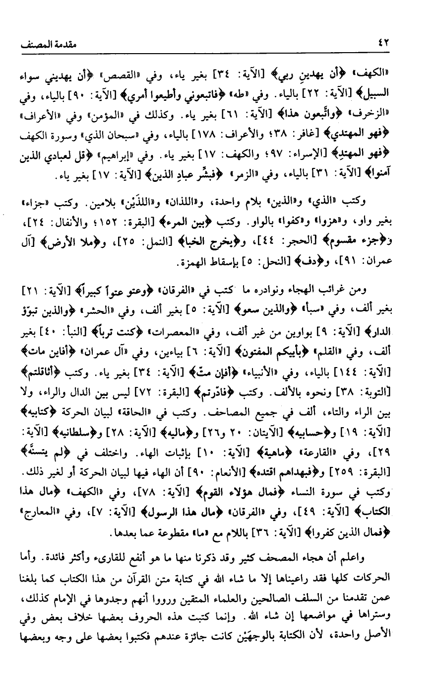 واعلم أن هجاء المصحف كثير وقد ذكرنا منها ما هو أنفع للقارىء وأكثر فائدة. وأما الحركات كلها فقد راعيناها إلا ما شاء الله في كتابة متن القرآن من هذا الكتاب كما بلغنا عمن تقدمنا من السلف الصالحين والعلماء المتقين ورووا أنهم وجدوها في الإمام كذلك، وستراها في مواضعها إن شاء الله. وإنما كتبت هذه الحروف بعضها خلاف بعض وفي الأصل واحدة، لأن الكتابة بالوجهين كانت جائزة عندهم فكتبوا بعضها على وجه وبعضها