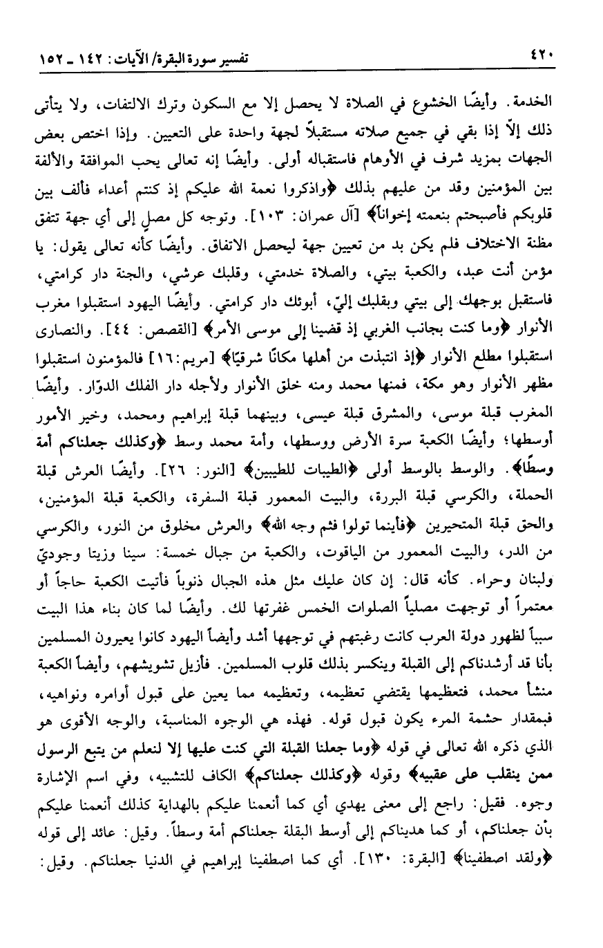 وتوجه كل مصل إلى أي جهة تتفق مظنة الاختلاف فلم يكن بد من تعيين جهة ليحصل الاتفاق. وأيضا كأنه تعالى يقول: يا مؤمن أنت عبد، والكعبة بيتي، والصلاة خدمتي، وقلبك عرشي، والجنة دار كرامتي، فاستقبل بوجهك إلى بيتي وبقلبك إليّ، أبوئك دار كرامتي. وأيضا اليهود استقبلوا مغرب الأنوار وَما كُنْتَ بِجانِبِ الْغَرْبِيِّ إِذْ قَضَيْنا إِلى مُوسَى الْأَمْرَ [القصص: 44] . والنصارى استقبلوا مطلع الأنوار إِذِ انْتَبَذَتْ مِنْ أَهْلِها مَكاناً شَرْقِيًّا
