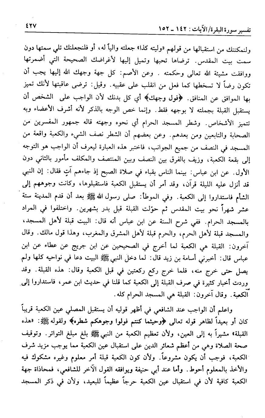 ولنمكننك من استقبالها من قولهم «وليته كذا» جعلته واليا له، أو فلنجعلنك تلي سمتها دون سمت بيت المقدس. ترضاها تحبها وتميل إليها لأغراضك الصحيحة التي أضمرتها ووافقت مشيئة الله تعالى وحكمته. وعن الأصم: كل جهة وجهك الله إليها يجب أن تكون رضا لا تسخطها كما فعل من انقلب على عقبيه. وقيل: ترضى عاقبتها لأنك تميز بها الموافق عن المنافق. فَوَلِّ وَجْهَكَ أي كل بدنك لأن الواجب على الشخص أن يستقبل القبلة بجملته لا بوجهه فقط. وإنما خص الوجه بالذكر لأنه أشرف الأعضاء وبه تتميز الأشخاص. وشطر المسجد الحرام أي نحوه وجهته قاله جمهور المفسرين من الصحابة والتابعين ومن بعدهم. وعن بعضهم أن الشطر نصف الشيء والكعبة واقعة من المسجد في النصف من جميع الجوانب، فاختبر هذه العبارة ليعرف أن الواجب هو التوجه إلى بقعة الكعبة، وزيف بالفرق بين النصف وبين المنتصف والمكلف مأمور بالثاني دون الأول. عن ابن عباس: بينما الناس بقباء في صلاة الصبح إذ جاءهم آت فقال: إن النبي قد أنزل عليه الليلة قرآن، وقد أمر أن يستقبل الكعبة فاستقبلوها، وكانت وجوههم إلى الشام فاستداروا إلى الكعبة. وفي الموطأ: صلى رسول الله صلى الله عليه وسلم بعد أن قدم المدينة ستة عشر شهرا نحو بيت المقدس ثم حوّلت القبلة قبل بدر بشهرين. واختلفوا في المراد بالمسجد الحرام. ففي شرح السنة عن ابن عباس أنه قال: البيت قبلة لأهل المسجد، والمسجد قبلة لأهل الحرم، والحرم قبلة لأهل المشرق والمغرب، وهذا قول مالك. وقال آخرون: القبلة هي الكعبة لما أخرج في الصحيحين عن ابن جريج عن عطاء عن ابن عباس قال: أخبرني أسامة بن زيد قال: لما دخل النبي صلى الله عليه وسلم البيت دعا في نواحيه كلها ولم يصل حتى خرج منه، فلما خرج ركع ركعتين في قبل الكعبة وقال: هذه القبلة. وقد وردت أخبار كثيرة في صرف القبلة إلى الكعبة كما قلنا في حديث ابن عمر، فاستداروا إلى الكعبة. وقال آخرون: القبلة هي المسجد الحرام كله.