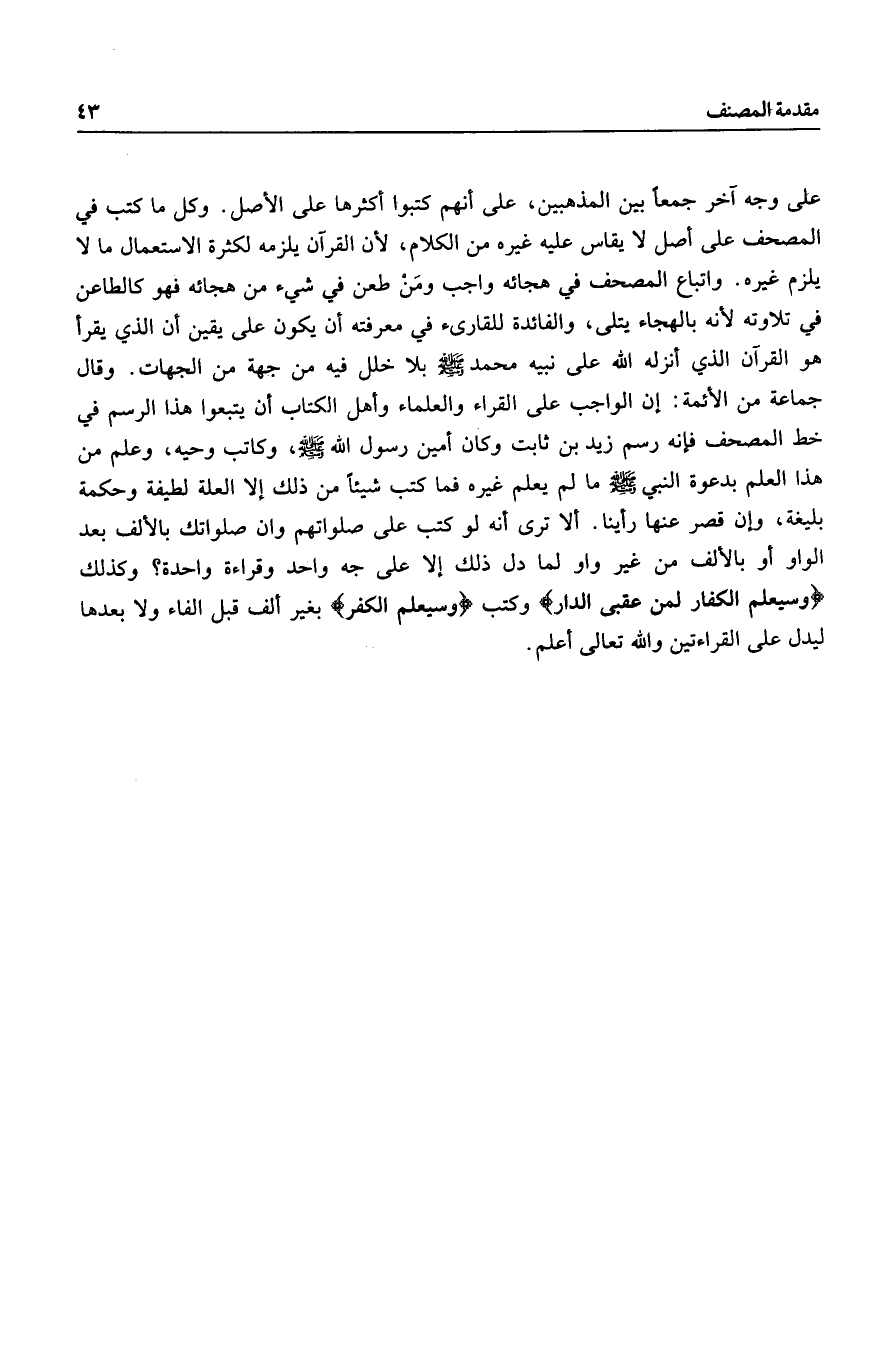 على وجه آخر جمعا بين المذهبين، على أنهم كتبوا أكثرها على الأصل. وكل ما كتب في المصحف على أصل لا يقاس عليه غيره من الكلام، لأن القرآن يلزمه لكثرة الاستعمال ما لا يلزم غيره. واتباع المصحف في هجائه واجب ومن طعن في شيء من هجائه فهو كالطاعن في تلاوته لأنه بالهجاء يتلى، والفائدة للقارىء في معرفته أن يكون على يقين أن الذي يقرأ هو القرآن الذي أنزله الله على نبيه محمد صلى الله عليه وسلم بلا خلل فيه من جهة من الجهات. وقال جماعة من الأئمة: إن الواجب على القراء والعلماء وأهل الكتاب أن يتبعوا هذا الرسم في خط المصحف فإنه رسم زيد بن ثابت وكان أمين رسول الله صلى الله عليه وسلم، وكاتب وحيه، وعلم من هذا العلم بدعوة النبي صلى الله عليه وسلم ما لم يعلم غيره فما كتب شيئا من ذلك إلا العلة لطيفة وحكمة بليغة، وإن قصر عنها رأينا. ألا ترى أنه لو كتب على صلواتهم وان صلواتك بالألف بعد الواو أو بالألف من غير واو لما دل ذلك إلا على جه واحد وقراءة واحدة؟ وكذلك وَسَيَعْلَمُ الْكُفَّارُ لِمَنْ عُقْبَى الدَّارِ وكتب وَسَيَعْلَمُ الْكُفَّارُ بغير ألف قبل الفاء ولا بعدها ليدل على القراءتين والله تعالى أعلم.
