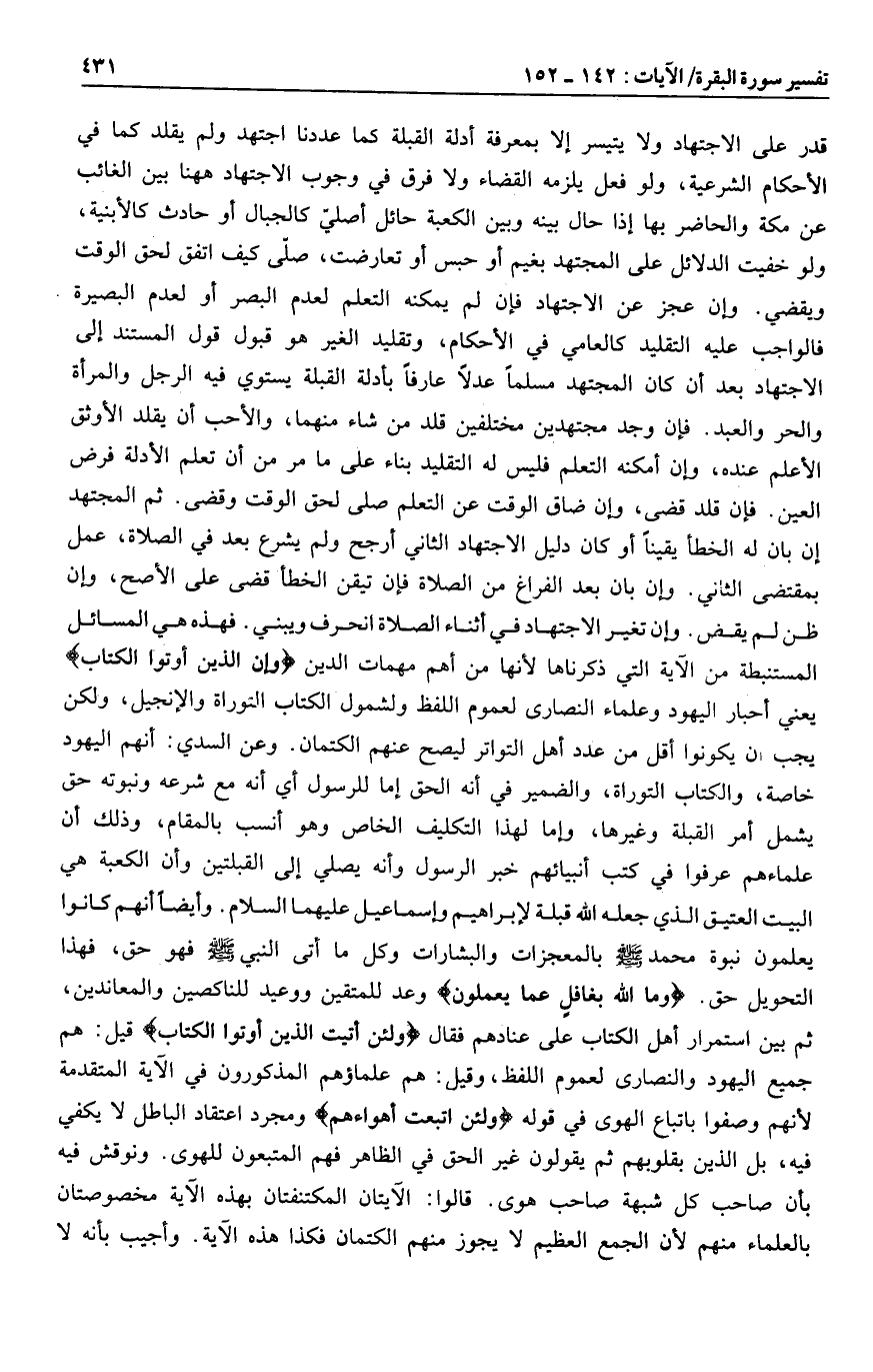 قدر على الاجتهاد ولا يتيسر إلا بمعرفة أدلة القبلة كما عددنا اجتهد ولم يقلد كما في الأحكام الشرعية، ولو فعل يلزمه القضاء ولا فرق في وجوب الاجتهاد هاهنا بين الغائب عن مكة والحاضر بها إذا حال بينه وبين الكعبة حائل أصليّ كالجبال أو حادث كالأبنية، ولو خفيت الدلائل على المجتهد بغيم أو حبس أو تعارضت، صلّى كيف اتفق لحق الوقت ويقتضي. وإن عجز عن الاجتهاد فإن لم يمكنه التعلم لعدم البصر أو لعدم البصيرة فالواجب عليه التقليد كالعامي في الأحكام، وتقليد الغير هو قبول قول المستند إلى الاجتهاد بعد أن كان المجتهد مسلما عدلا عارفا بأدلة القبلة يستوي فيه الرجل والمرأة والحر والعبد. فإن وجد مجتهدين مختلفين قلد من شاء منهما، والأحب أن يقلد الأوثق الأعلم عنده، وإن أمكنه التعلم فليس له التقليد بناء على ما مر من أن تعلم الأدلة فرض العين. فإن قلد قضى، وإن ضاق الوقت عن التعلم صلى لحق الوقت وقضى. ثم المجتهد إن بان له الخطأ يقينا أو كان دليل الاجتهاد الثاني أرجح ولم يشرع بعد في الصلاة، عمل بمقتضى الثاني. وإن بان بعد الفراغ من الصلاة فإن تيقن الخطأ قضى على الأصح، وإن ظن لم يقض. وإن تغير الاجتهاد في أثناء الصلاة انحرف ويبني. فهذه هي المسائل المستنبطة من الآية التي ذكرناها لأنها من أهم مهمات الدين وَإِنَّ الَّذِينَ أُوتُوا الْكِتابَ يعني أحبار اليهود وعلماء النصارى لعموم اللفظ ولشمول الكتاب التوراة والإنجيل، ولكن يجب أن يكونوا أقل من عدد أهل التواتر ليصح عنهم الكتمان. وعن السدي: أنهم اليهود خاصة، والكتاب التوراة، والضمير في أنه الحق إما للرسول أي أنه مع شرعه ونبوته حق يشمل أمر القبلة وغيرها، وإما لهذا التكليف الخاص وهو أنسب بالمقام، وذلك أن علماءهم عرفوا في كتب أنبيائهم خبر الرسول وأنه يصلي إلى القبلتين وأن الكعبة هي البيت العتيق الذي جعله الله قبلة لإبراهيم وإسماعيل عليهما السلام. وأيضا أنهم كانوا يعلمون نبوة محمد صلى الله عليه وسلم بالمعجزات والبشارات وكل ما أتى النبي صلى الله عليه وسلم فهو حق، فهذا التحويل حق. وَمَا اللَّهُ بِغافِلٍ عَمَّا يَعْمَلُونَ وعد للمتقين ووعيد للناكصين والمعاندين، ثم بين استمرار أهل الكتاب على عنادهم فقال وَلَئِنْ أَتَيْتَ الَّذِينَ أُوتُوا الْكِتابَ قيل: هم جميع اليهود والنصارى لعموم اللفظ، وقيل: هم علماؤهم المذكورون في الآية المتقدمة لأنهم وصفوا باتباع الهوى في قوله وَلَئِنِ اتَّبَعْتَ أَهْواءَهُمْ ومجرد اعتقاد الباطل لا يكفي فيه، بل الذين بقلوبهم ثم يقولون غير الحق في الظاهر فهم المتبعون للهوى. ونوقش فيه بأن صاحب كل شبهة صاحب هوى. قالوا: الآيتان المكتنفتان بهذه الآية مخصوصتان بالعلماء منهم لأن الجمع العظيم لا يجوز منهم الكتمان فكذا هذه الآية. وأجيب بأنه لا