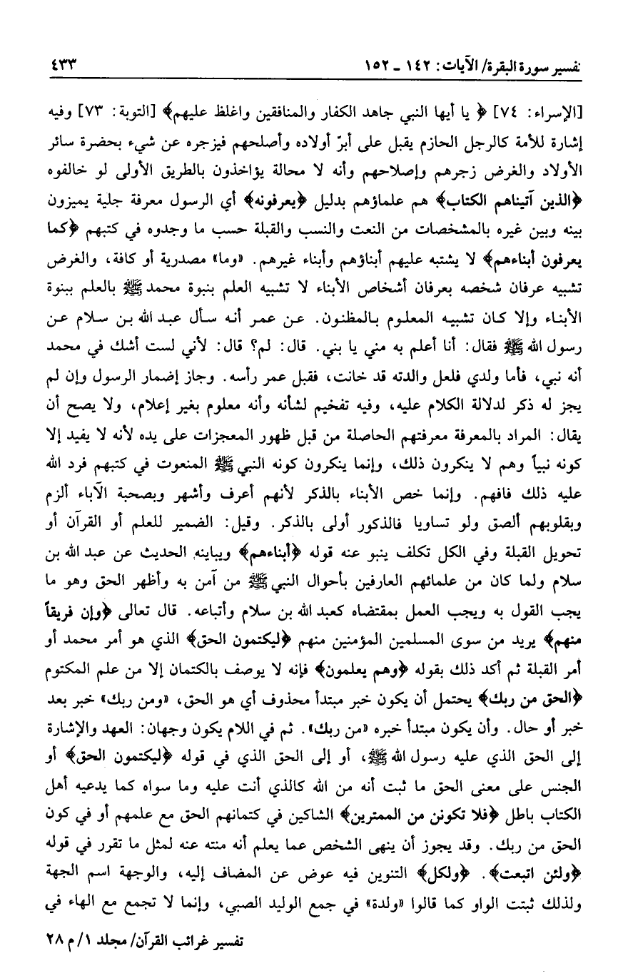 [الإسراء: 74] يا أَيُّهَا النَّبِيُّ جاهِدِ الْكُفَّارَ وَالْمُنافِقِينَ وَاغْلُظْ عَلَيْهِمْ [التوبة: 73] وفيه إشارة للأمة كالرجل الحازم يقبل على أبرّ أولاده وأصلحهم فيزجره عن شيء بحضرة سائر الأولاد والغرض زجرهم وإصلاحهم وأنه لا محالة يؤاخذون بالطريق الأولى لو خالفوه الَّذِينَ آتَيْناهُمُ الْكِتابَ هم علماؤهم بدليل يَعْرِفُونَهُ أي الرسول معرفة جلية يميزون بينه وبين غيره بالمشخصات من النعت والنسب والقبلة حسب ما وجدوه في كتبهم كَما يَعْرِفُونَ أَبْناءَهُمْ لا يشتبه عليهم أبناؤهم وأبناء غيرهم. «وما» مصدرية أو كافة، والغرض تشبيه عرفان شخصه بعرفان أشخاص الأبناء لا تشبيه العلم بنبوة محمد صلى الله عليه وسلم بالعلم ببنوة الأبناء وإلا كان تشبيه المعلوم بالمظنون.