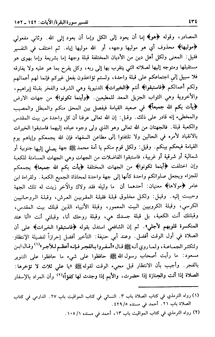 في صعيد القيامة فيفصل بين المحق منكم والمبطل والمصيب والمخطئ إنه قادر على ذلك. وقيل: إن الله تعالى عرفنا أن كل واحدة من بيت المقدس والكعبة قبلة. فالجهتان من الله تعالى وهو الذي ولى وجوه عباده إليهما فاستبقوا الخيرات بالانقياد لأمره في الحالين ولا تلتفتوا إلى مطاعن السفهاء فإن الله يجمعكم وإياهم يوم القيامة فيحكم بينكم. وقيل: ولكل قوم منكم يا أمة محمد صلى الله عليه وسلم جهة يصلي إليها جنوبية أو شمالية أو شرقية أو غربية، فاستبقوا الفاضلات من الجهات وهي الجهات المسامتة للكعبة وإن اختلفت أَيْنَما تَكُونُوا من الجهات المختلفةأْتِ بِكُمُ اللَّهُ جَمِيعاً