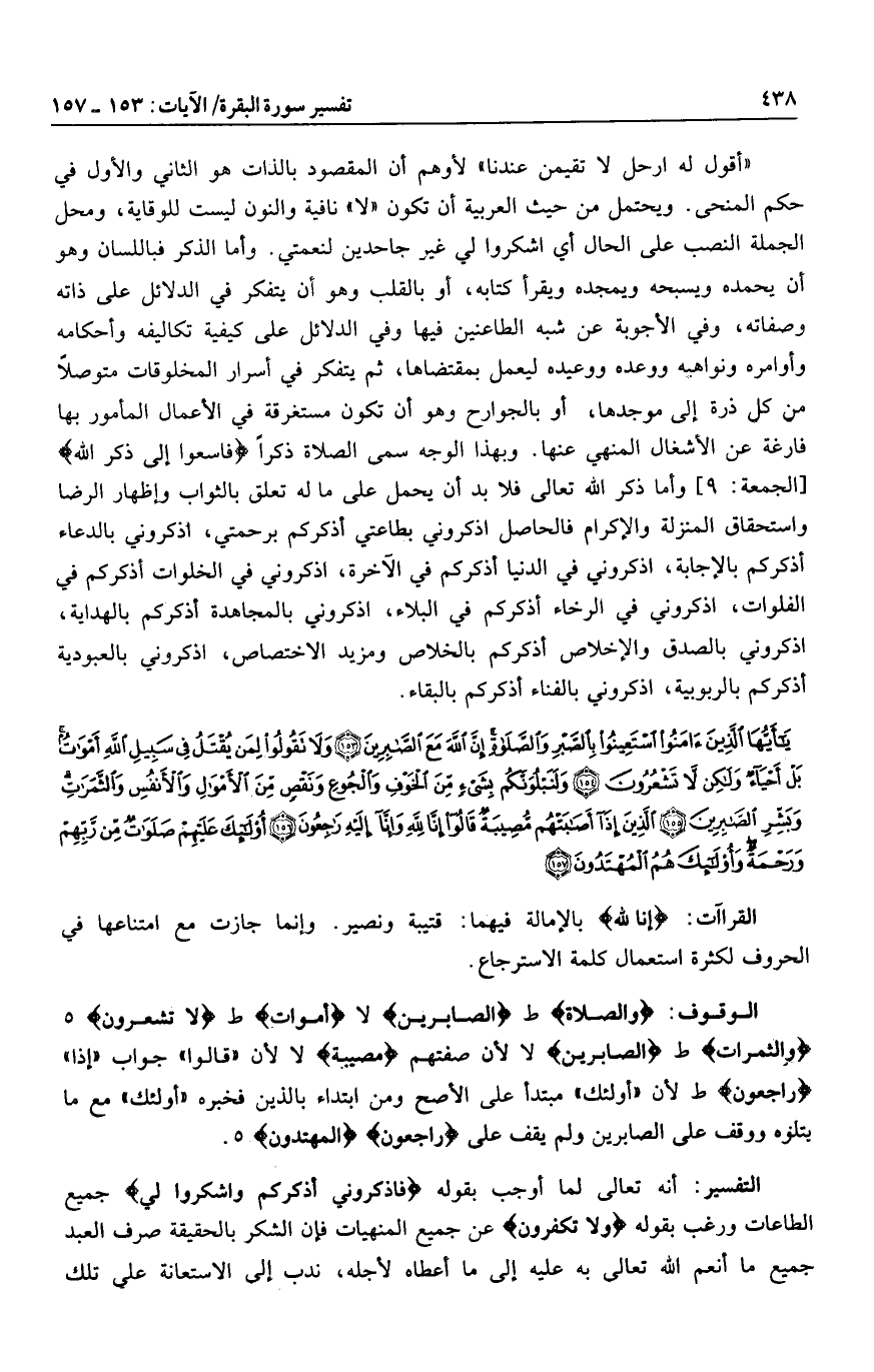 «أقول له ارحل لا تقيمن عندنا» لأوهم أن المقصود بالذات هو الثاني والأول في حكم المنحى. ويحتمل من حيث العربية أن تكون «لا» نافية والنون ليست للوقاية، ومحل الجملة النصب على الحال أي اشكروا لي غير جاحدين لنعمتي. وأما الذكر فباللسان وهو أن يحمده ويسبحه ويمجده ويقرأ كتابه، أو بالقلب وهو أن يتفكر في الدلائل على ذاته وصفاته، وفي الأجوبة عن شبه الطاعنين فيها وفي الدلائل على كيفية تكاليفه وأحكامه وأوامره ونواهيه ووعده ووعيده ليعمل بمقتضاها، ثم يتفكر في أسرار المخلوقات متوصلا من كل ذرة إلى موجدها، أو بالجوارح وهو أن تكون مستغرقة في الأعمال المأمور بها فارغة عن الأشغال المنهي عنها. وبهذا الوجه سمى الصلاة ذكرا فَاسْعَوْا إِلى ذِكْرِ اللَّهِ [الجمعة: 9] وأما ذكر الله تعالى فلا بد أن يحمل على ما له تعلق بالثواب وإظهار الرضا واستحقاق المنزلة والإكرام فالحاصل اذكروني بطاعتي أذكركم برحمتي، اذكروني بالدعاء أذكركم بالإجابة، اذكروني في الدنيا أذكركم في الآخرة، اذكروني في الخلوات أذكركم في الفلوات، اذكروني في الرخاء أذكركم في البلاء، اذكروني بالمجاهدة أذكركم بالهداية، اذكروني بالصدق والإخلاص أذكركم بالخلاص ومزيد الاختصاص، اذكروني بالعبودية أذكركم بالربوبية، اذكروني بالفناء أذكركم بالبقاء.
