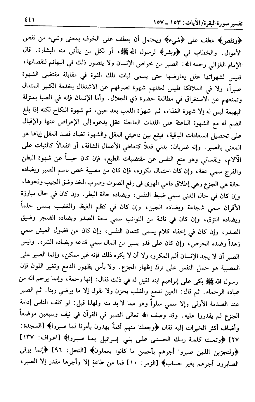 وَنَقْصٍ عطف على بِشَيْءٍ ويحتمل أن يعطف على الخوف بمعنى وشيء من نقص الأموال. والخطاب في وَبَشِّرِ لرسول الله صلى الله عليه وسلم، أو لكل من يتأتى منه البشارة. قال الإمام الغزالي رحمه الله: الصبر من خواص الإنسان ولا يتصور ذلك في البهائم لنقصانها، فليس لشهواتها عقل يعارضها حتى يسمى ثبات تلك القوة في مقابلة مقتضى الشهوة صبرا، ولا في الملائكة فليس لعقلهم شهوة تصرفهم عن الاشتغال بخدمة الكبير المتعال وتمنعهم عن الاستغراق في مطالعة حضرة ذي الجلال. وأما الإنسان فإنه في الصبا بمنزلة البهيمة ليس له إلا شهوة الغذاء، ثم شهوة اللعب بعد حين، ثم شهوة النكاح لكنه إذا بلغ انضم له مع الشهوة الباعثة على اللذات العاجلة عقل يدعوه إلى الإعراض عنها والإقبال على تحصيل السعادات الباقية، فيقع بين داعيتي العقل والشهوة تضاد قصد العقل إياها هو المعنى بالصبر. وإنه ضربان: بدني فعلا كتعاطي الأعمال الشاقة، أو انفعالا كالثبات على الآلام، ونفساني وهو منع النفس عن مقتضيات الطبع، فإن كان حبسا عن شهوة البطن والفرج سمي عفة، وإن كان احتمال مكروه، فإن كان من مصيبة خص باسم الصبر ويضاده حالة هي الجزع وهي إطلاق داعي الهوى في رفع الصوت وضرب الخد وشق الجيب ونحوها، وإن كان في حال الغنى سمي ضبط النفس، ويضاده حالة البطر. وإن كان في حال مبارزة الأقران سمي شجاعة ويضاده الجبن، وإن كان في كظم الغيظ والغضب يسمى حلما ويضاده النزق، وإن كان في نائبة من النوائب سمي سعة الصدر ويضاده الضجر وضيق الصدر، وإن كان في إخفاء كلام يسمى كتمان النفس، وإن كان عن فضول العيش سمي زهدا وضده الحرص، وإن كان على قدر يسير من المال سمي قناعه ويضاده الشره. وليس الصبر أن لا يجد الإنسان ألم المكروه ولا أن لا يكره ذلك فإنه غير ممكن، وإنما الصبر على المصيبة هو حمل النفس على ترك إظهار الجزع. ولا بأس بظهور الدمع وتغير اللون