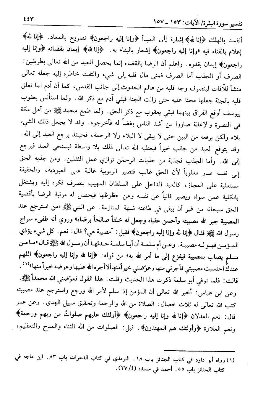 أنفسنا بالهلك إِنَّا لِلَّهِ إشارة إلى المبدأ وَإِنَّا إِلَيْهِ راجِعُونَ تصريح بالمعاد. إِنَّا لِلَّهِ إعلام بالفناء فيه وَإِنَّا إِلَيْهِ راجِعُونَ إشعار بالبقاء به. إِنَّا لِلَّهِ إيمان بقضائه وَإِنَّا إِلَيْهِ راجِعُونَ إيمان بقدره. واعلم أن الرضا بالقضاء إنما يحصل للعبد من الله تعالى بطريقين: