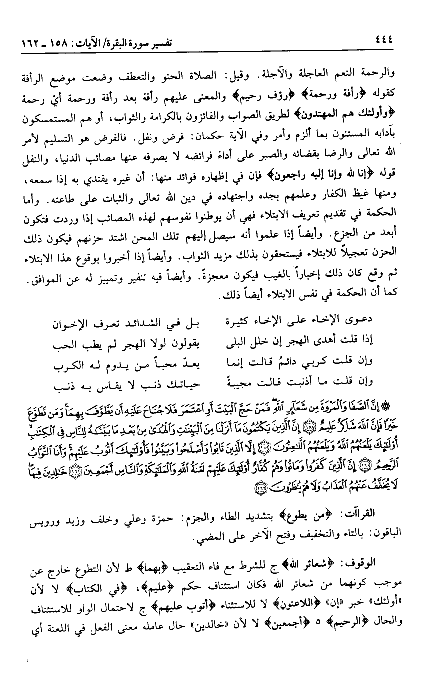 شَعائِرِ اللَّهِ ج للشرط مع فاء التعقيب بِهِما ط لأن التطوع خارج عن موجب كونهما من شعائر الله فكان استئناف حكم عَلِيمٌ، فِي الْكِتابِ لا لأن «أولئك» خبر «إن» اللَّاعِنُونَ لا للاستثناء أَتُوبُ عَلَيْهِمْ ج لاحتمال الواو للاستئناف والحال الرَّحِيمُ هـ أَجْمَعِينَ لا لأن «خالدين» حال عامله معنى الفعل في اللعنة أي