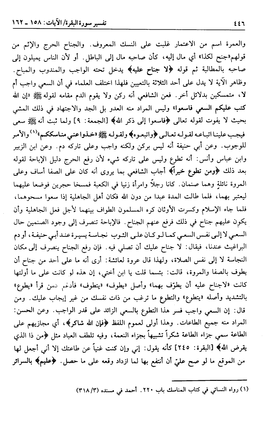 والأمر للوجوب. وعن أبي حنيفة أنه ليس بركن ولكنه واجب وعلى تاركه دم. وعن ابن الزبير وابن عباس وأنس: أنه تطوع وليس على تاركه شيء لأن رفع الحرج دليل الإباحة لقوله بعد ذلك وَمَنْ تَطَوَّعَ خَيْراً أجاب الشافعي بما يروى أنه كان على الصفا أساف وعلى المروة نائلة وهما صنمان. كانا رجلا وامرأة زنيا في الكعبة فمسخا حجرين فوضعا عليهما ليعتبر بهما، فلما طالت المدة عبدا من دون الله فكان أهل الجاهلية إذا سعوا مسحوهما، فلما جاء الإسلام وكسرت الأوثان كره المسلمون الطواف بينهما لأجل فعل الجاهلية وأن يكون عليهم جناح في ذلك فرفع عنهم الجناح. فالإباحة تنصرف إلى وجود الصنمين حال السعي لا إلى نفس السعي كما لو كان على الثوب نجاسة يسيرة عند أبي حنيفة، أو دم البراغيث عندنا، فيقال: لا جناح عليك أن تصلي فيه. فإن رفع الجناح ينصرف إلى مكان النجاسة لا إلى نفس الصلاة، ولهذا قال عروة لعائشة: أرى أنه ما على أحد من جناح أن يطوف بالصفا والمروة، قالت: بئسما قلت يا ابن أختي، إن هذه لو كانت على ما أولتها كانت «لا جناح عليه أن يطوّف بهما» وأصل «يطوف» «يتطوف» فأدغم كمن قرأ «يطوع» بالتشديد وأصله «يتطوع» والتطوع ما ترغب من ذات نفسك من غير إيجاب عليك. ومن قال: إن السعي واجب فسر هذا التطوع بالسعي الزائد على قدر الواجب. وعن الحسن: