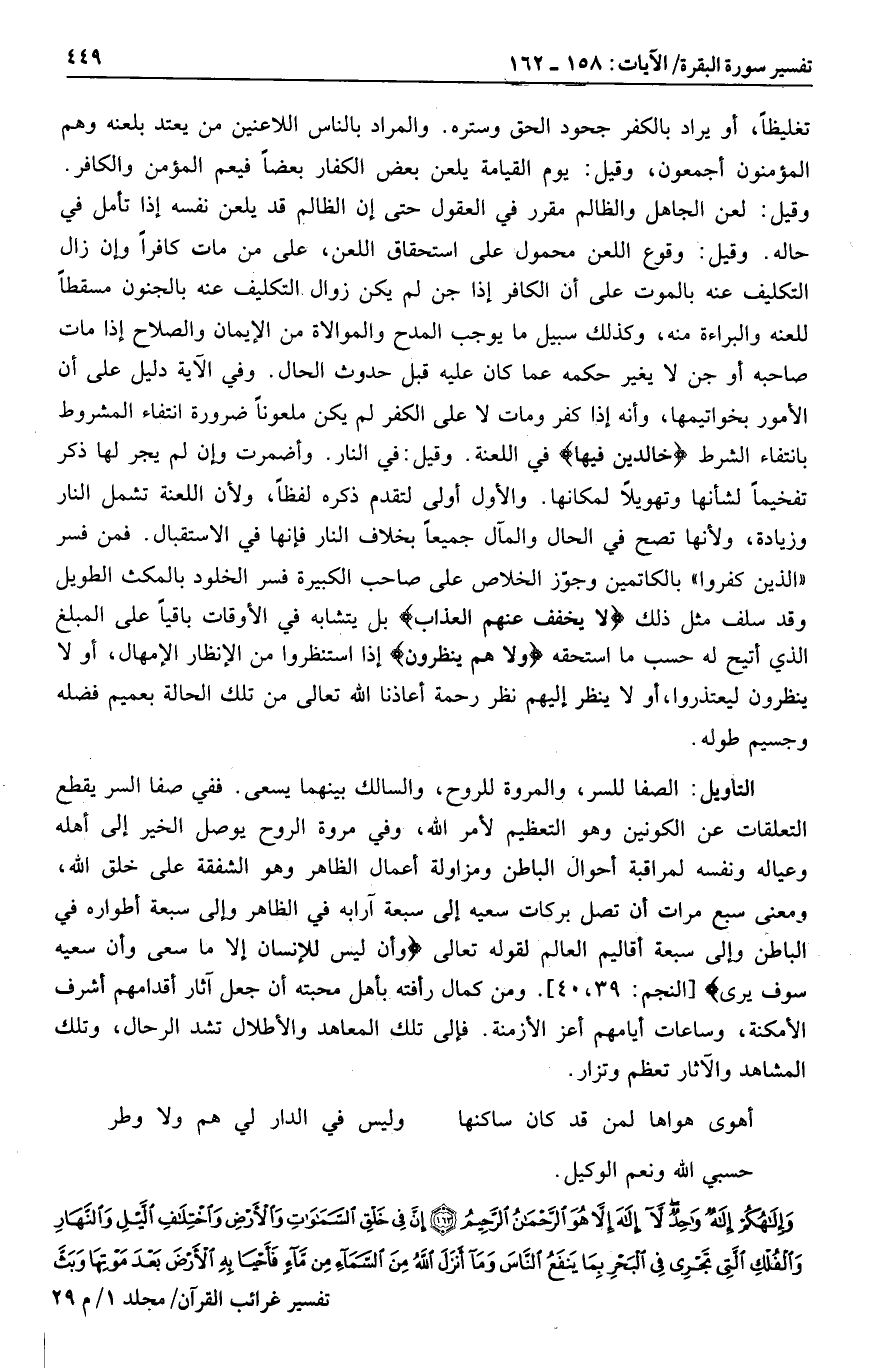 التأويل: الصفا للسر، والمروة للروح، والسالك بينهما يسعى. ففي صفا السر يقطع التعلقات عن الكونين وهو التعظيم لأمر الله، وفي مروة الروح يوصل الخير إلى أهله وعياله ونفسه لمراقبة أحوال الباطن ومزاولة أعمال الظاهر وهو الشفقة على خلق الله، ومعنى سبع مرات أن تصل بركات سعيه إلى سبعة آرابه في الظاهر وإلى سبعة أطواره في الباطن وإلى سبعة أقاليم العالم لقوله تعالى وَأَنْ لَيْسَ لِلْإِنْسانِ إِلَّا ما سَعى وَأَنَّ سَعْيَهُ سَوْفَ يُرى [النجم: 39، 40] . ومن كمال رأفته بأهل محبته أن جعل آثار أقدامهم أشرف الأمكنة، وساعات أيامهم أعز الأزمنة. فإلى تلك المعاهد والأطلال تشد الرحال، وتلك المشاهد والآثار تعظم وتزار.