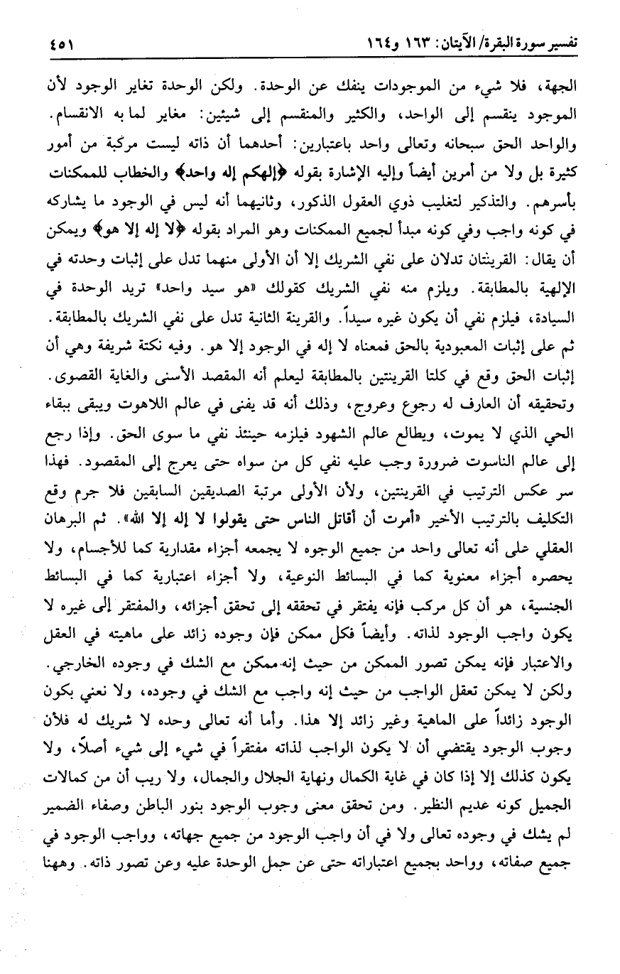 ولكن لا يمكن تعقل الواجب من حيث إنه واجب مع الشك في وجوده، ولا نعني بكون الوجود زائدا على الماهية وغير زائد إلا هذا. وأما أنه تعالى وحده لا شريك له فلأن وجوب الوجود يقتضي أن لا يكون الواجب لذاته مفتقرا في شيء إلى شيء أصلا، ولا يكون كذلك إلا إذا كان في غاية الكمال ونهاية الجلال والجمال، ولا ريب أن من كمالات الجميل كونه عديم النظير. ومن تحقق معنى وجوب الوجود بنور الباطن وصفاء الضمير لم يشك في وجوده تعالى ولا في أن واجب الوجود من جميع جهاته، وواجب الوجود في جميع صفاته، وواحد بجميع اعتباراته حتى عن جمل الوحدة عليه وعن تصور ذاته. وهاهنا