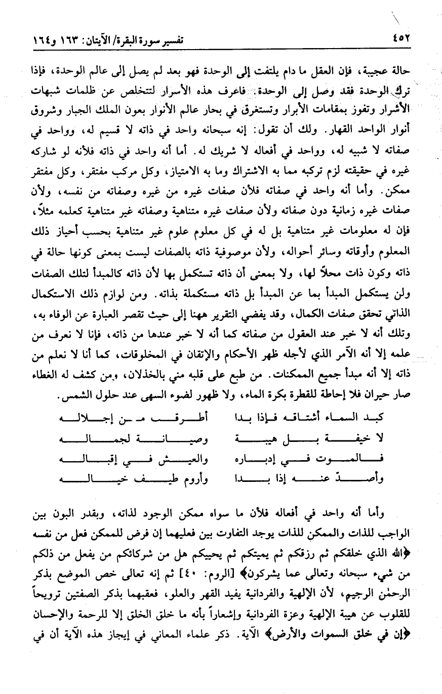 وأما أنه واحد في أفعاله فلأن ما سواه ممكن الوجود لذاته، وبقدر البون بين الواجب للذات والممكن للذات يوجد التفاوت بين فعليهما إن فرض للمكن فعل من نفسه اللَّهُ الَّذِي خَلَقَكُمْ ثُمَّ رَزَقَكُمْ ثُمَّ يُمِيتُكُمْ ثُمَّ يُحْيِيكُمْ هَلْ مِنْ شُرَكائِكُمْ مَنْ يَفْعَلُ مِنْ ذلِكُمْ مِنْ شَيْءٍ سُبْحانَهُ وَتَعالى عَمَّا يُشْرِكُونَ [الروم: 40] ثم إنه تعالى خص الموضع بذكر الرحمن الرحيم، لأن الإلهية والفردانية يفيد القهر والعلو، فعقبهما بذكر الصفتين ترويحا للقلوب عن هيبة الإلهية وعزة الفردانية وإشعارا بأنه ما خلق الخلق إلا للرحمة والإحسان إِنَّ فِي خَلْقِ السَّماواتِ وَالْأَرْضِ الآية. ذكر علماء المعاني في إيجاز هذه الآية أن في