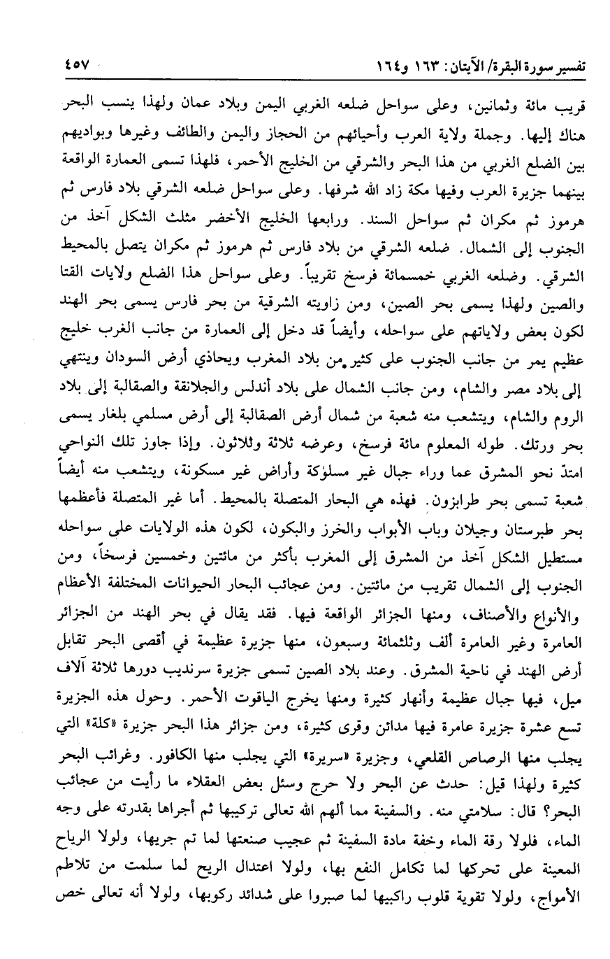 قريب مائة وثمانين، وعلى سواحل ضلعه الغربي اليمن وبلاد عمان ولهذا ينسب البحر هناك إليها. وجملة ولاية العرب وأحيائهم من الحجاز واليمن والطائف وغيرها وبواديهم بين الضلع الغربي من هذا البحر والشرقي من الخليج الأحمر، فلهذا تسمى العمارة الواقعة بينهما جزيرة العرب وفيها مكة زاد الله شرفها. وعلى سواحل ضلعه الشرقي بلاد فارس ثم هرموز ثم مكران ثم سواحل السند. ورابعها الخليج الأخضر مثلث الشكل آخذ من الجنوب إلى الشمال. ضلعه الشرقي من بلاد فارس ثم هرموز ثم مكران يتصل بالمحيط الشرقي. وضلعه الغربي خمسمائة فرسخ تقريبا. وعلى سواحل هذا الضلع ولايات القتا والصين ولهذا يسمى بحر الصين، ومن زاويته الشرقية من بحر فارس يسمى بحر الهند لكون بعض ولاياتهم على سواحله، وأيضا قد دخل إلى العمارة من جانب الغرب خليج عظيم يمر من جانب الجنوب على كثير من بلاد المغرب ويحاذي أرض السودان وينتهي إلى بلاد مصر والشام، ومن جانب الشمال على بلاد أندلس والجلانقة والصقالبة إلى بلاد الروم والشام، ويتشعب منه شعبة من شمال أرض الصقالبة إلى أرض مسلمي بلغار يسمى بحر ورتك. طوله المعلوم مائة فرسخ، وعرضه ثلاثة وثلاثون. وإذا جاوز تلك النواحي امتدّ نحو المشرق عما وراء جبال غير مسلوكة وأرض غير مسكونة، ويتشعب منه أيضا شعبة تسمى بحر طرابزون. فهذه هي البحار المتصلة بالمحيط. أما غير المتصلة فأعظمها بحر طبرستان وجيلان وباب الأبواب والخرز والبكون، لكون هذه الولايات على سواحله مستطيل الشكل آخذ من المشرق إلى المغرب بأكثر من مائتين وخمسين فرسخا، ومن الجنوب إلى الشمال تقريب من مائتين. ومن عجائب البحار الحيوانات المختلفة الأعظام والأنواع والأصناف، ومنها الجزائر الواقعة فيها. فقد يقال في بحر الهند من الجزائر العامرة وغير العامرة ألف وثلاثمائة وسبعون، منها جزيرة عظيمة في أقصى البحر تقابل أرض الهند في ناحية المشرق. وعند بلاد الصين تسمى جزيرة سرنديب دورها ثلاثة آلاف ميل، فيها جبال عظيمة وأنهار كثيرة ومنها يخرج الياقوت الأحمر. وحول هذه الجزيرة تسع عشرة جزيرة عامرة فيها مدائن وقرى كثيرة، ومن جزائر هذا البحر جزيرة «كلة» التي يجلب منها الرصاص القلعي، وجزيرة «سريرة» التي يجلب منها الكافور. وغرائب البحر كثيرة ولهذا قيل: حدث عن البحر ولا حرج وسئل بعض العقلاء ما رأيت من عجائب البحر؟ قال: سلامتي منه. والسفينة مما ألهم الله تعالى تركيبها ثم أجراها بقدرته على وجه الماء، فلولا رقة الماء وخفة مادة السفينة ثم عجيب صنعتها لما تم جريها، ولولا الرياح المعينة على تحركها لما تكامل النفع بها، ولولا اعتدال الريح لما سلمت من تلاطم الأمواج، ولولا تقوية قلوب راكبيها لما صبروا على شدائد ركوبها، ولولا أنه تعالى خص