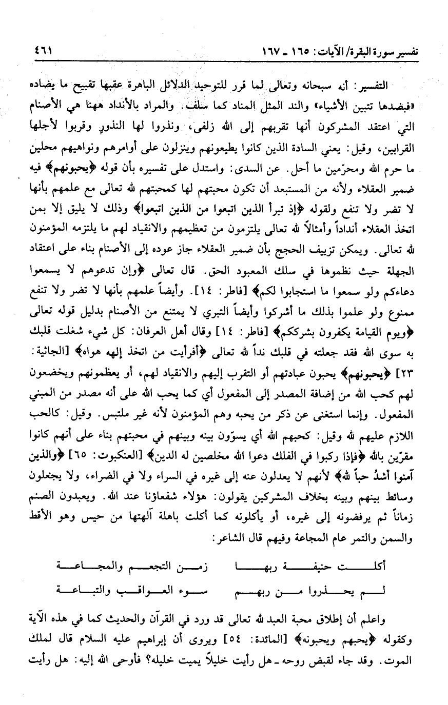23] يُحِبُّونَهُمْ يحبون عبادتهم أو التقرب إليهم والانقياد لهم، أو يعظمونهم ويخضعون لهم كحب الله من إضافة المصدر إلى المفعول أي كما يحب الله على أنه مصدر من المبني المفعول. وإنما استغنى عن ذكر من يحبه وهم المؤمنون لأنه غير ملتبس. وقيل: كالحب اللازم عليهم لله وقيل: كحبهم الله أي يسوّون بينه وبينهم في محبتهم بناء على أنهم كانوا مقرّين بالله فَإِذا رَكِبُوا فِي الْفُلْكِ دَعَوُا اللَّهَ مُخْلِصِينَ لَهُ الدِّينَ [العنكبوت: 65] وَالَّذِينَ آمَنُوا أَشَدُّ حُبًّا لِلَّهِ لأنهم لا يعدلون عنه إلى غيره في السراء ولا في الضراء، ولا يجعلون وسائط بينهم وبينه بخلاف المشركين يقولون: هؤلاء شفعاؤنا عند الله. ويعبدون الصنم زمانا ثم يرفضونه إلى غيره، أو يأكلونه كما أكلت باهلة آلهتها من حيس وهو الأقط والسمن والتمر عام المجاعة وفيهم قال الشاعر: