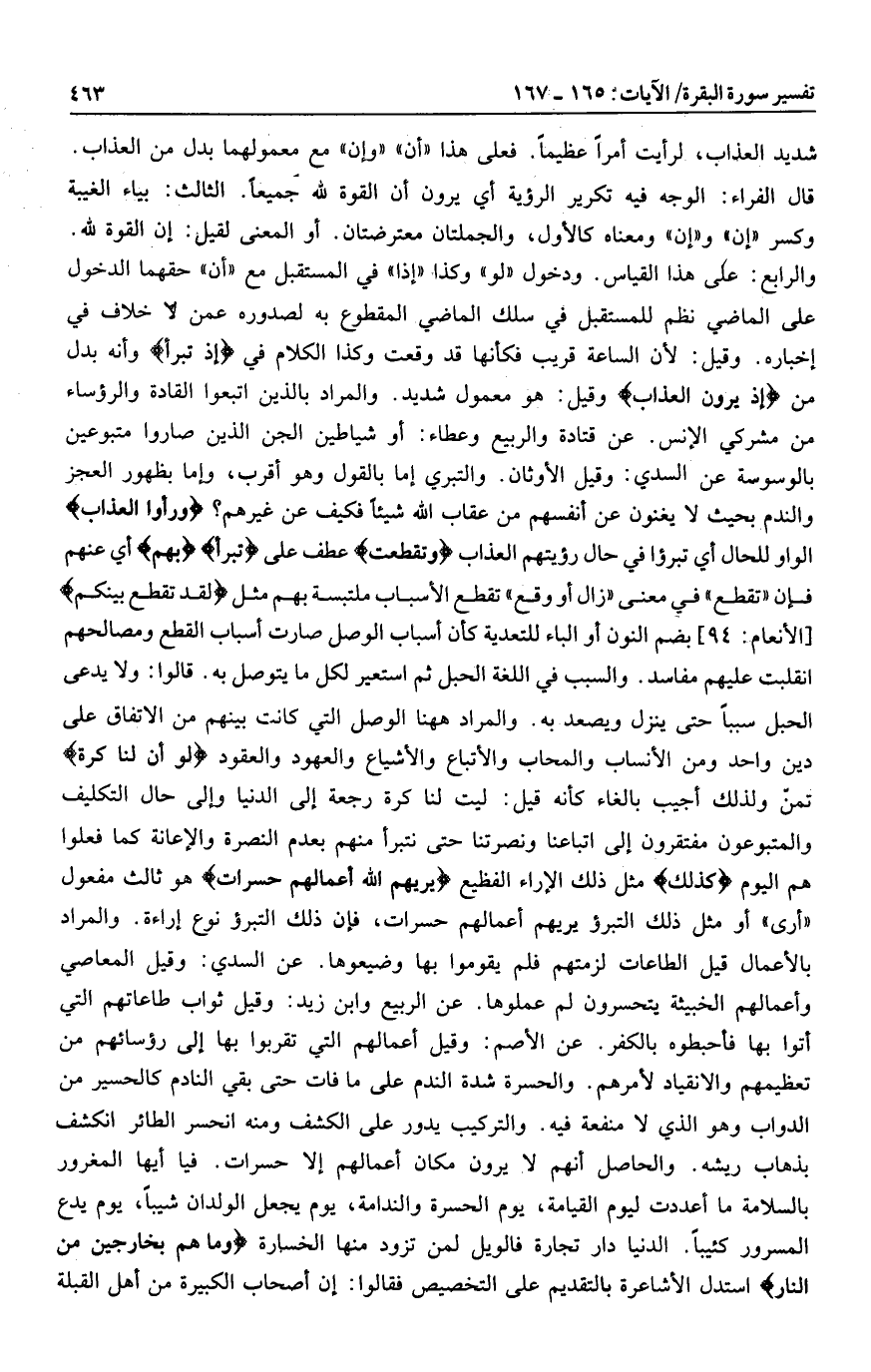 والرابع: على هذا القياس. ودخول «لو» وكذا «إذا» في المستقبل مع «أن» حقهما الدخول على الماضي نظم للمستقبل في سلك الماضي المقطوع به لصدوره عمن لا خلاف في إخباره. وقيل: لأن الساعة قريب فكأنها قد وقعت وكذا الكلام في إِذْ تَبَرَّأَ وأنه بدل من إِذْ يَرَوْنَ الْعَذابَ وقيل: هو معمول شديد. والمراد بالذين اتبعوا القادة والرؤساء من مشركي الإنس. عن قتادة والربيع وعطاء: أو شياطين الجن الذين صاروا متبوعين بالوسوسة عن السدي: وقيل الأوثان. والتبري إما بالقول وهو أقرب، وإما بظهور العجز والندم بحيث لا يغنون عن أنفسهم من عقاب الله شيئا فكيف عن غيرهم؟ وَرَأَوُا الْعَذابَ الواو للحال أي تبرؤا في حال رؤيتهم العذاب وَتَقَطَّعَتْ عطف على تَبَرَّأَ بِهِمُ أي عنهم فإن «تقطع» في معنى «زال أو وقع» تقطع الأسباب ملتبسة بهم مثل لَقَدْ تَقَطَّعَ بَيْنَكُمْ [الأنعام: 94] بضم النون أو الباء للتعدية كأن أسباب الوصل صارت أسباب القطع ومصالحهم انقلبت عليهم مفاسد. والسبب في اللغة الحبل ثم استعير لكل ما يتوصل به. قالوا: ولا يدعى الحبل سببا حتى ينزل ويصعد به. والمراد هاهنا الوصل التي كانت بينهم من الاتفاق على دين واحد ومن الأنساب والمحاب والأتباع والأشياع والعهود والعقود لَوْ أَنَّ لَنا كَرَّةً تمنّ ولذلك أجيب بالفاء كأنه قيل: ليت لنا كرة رجعة إلى الدنيا وإلى حال التكليف والمتبوعون مفتقرون إلى اتباعنا ونصرتنا حتى نتبرأ منهم بعدم النصرة والإعانة كما فعلوا هم اليوم كَذلِكَ مثل ذلك الإراء الفظيع يُرِيهِمُ اللَّهُ أَعْمالَهُمْ حَسَراتٍ هو ثالث مفعول «أرى» أو مثل ذلك التبرؤ يريهم أعمالهم حسرات، فإن ذلك التبرؤ نوع إراءة. والمراد بالأعمال قيل الطاعات لزمتهم فلم يقوموا بها وضيعوها. عن السدي: وقيل المعاصي وأعمالهم الخبيثة يتحسرون لم عملوها. عن الربيع وابن زيد: وقيل ثواب طاعاتهم التي أتوا بها فأحبطوه بالكفر. عن الأصم: وقيل أعمالهم التي تقربوا بها إلى رؤسائهم من تعظيمهم والانقياد لأمرهم. والحسرة شدة الندم على ما فات حتى بقي النادم كالحسير من الدواب وهو الذي لا منفعة فيه. والتركيب يدور على الكشف ومنه انحسر الطائر انكشف بذهاب ريشه. والحاصل أنهم لا يرون مكان أعمالهم إلا حسرات. فيا أيها المغرور بالسلامة ما أعددت ليوم القيامة، يوم الحسرة والندامة، يوم يجعل الولدان شيبا، يوم يدع المسرور كئيبا. الدنيا دار تجارة فالويل لمن تزود منها الخسارة وَما هُمْ بِخارِجِينَ مِنَ النَّارِ استدل الأشاعرة بالتقديم على التخصيص فقالوا: إن أصحاب الكبيرة من أهل القبلة
