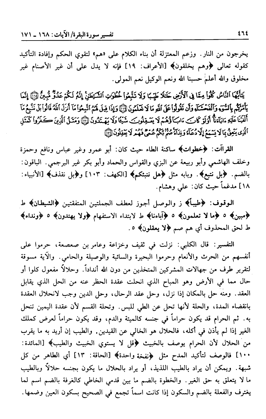 يا أَيُّهَا النَّاسُ كُلُوا مِمَّا فِي الْأَرْضِ حَلالاً طَيِّباً وَلا تَتَّبِعُوا خُطُواتِ الشَّيْطانِ إِنَّهُ لَكُمْ عَدُوٌّ مُبِينٌ (168) إِنَّما يَأْمُرُكُمْ بِالسُّوءِ وَالْفَحْشاءِ وَأَنْ تَقُولُوا عَلَى اللَّهِ ما لا تَعْلَمُونَ (169) وَإِذا قِيلَ لَهُمُ اتَّبِعُوا ما أَنْزَلَ اللَّهُ قالُوا بَلْ نَتَّبِعُ ما أَلْفَيْنا عَلَيْهِ آباءَنا أَوَلَوْ كانَ آباؤُهُمْ لا يَعْقِلُونَ شَيْئاً وَلا يَهْتَدُونَ (170) وَمَثَلُ الَّذِينَ كَفَرُوا كَمَثَلِ الَّذِي يَنْعِقُ بِما لا يَسْمَعُ إِلاَّ دُعاءً وَنِداءً صُمٌّ بُكْمٌ عُمْيٌ فَهُمْ لا يَعْقِلُونَ (171)