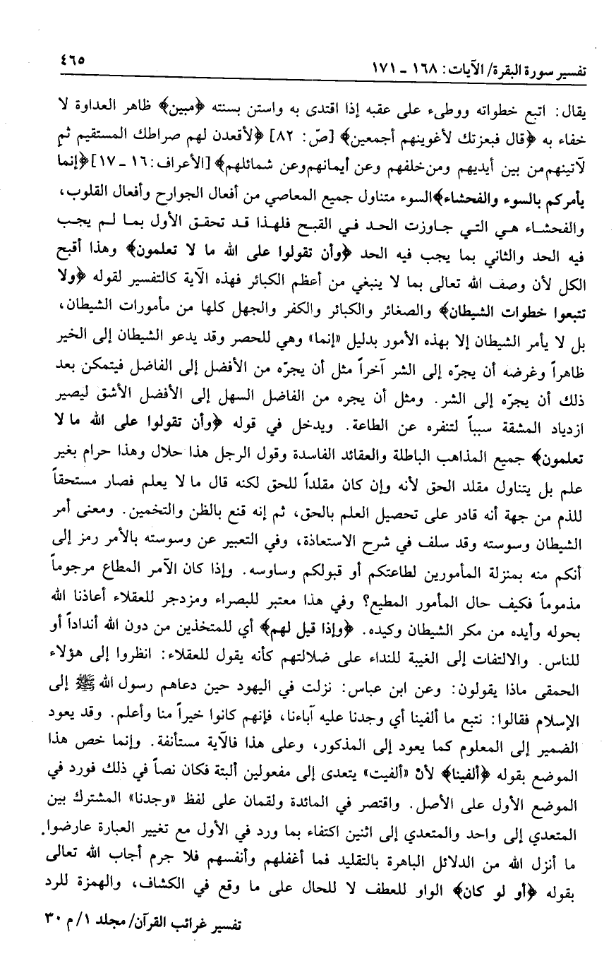 يقال: اتبع خطواته ووطئ على عقبه إذا اقتدى به واستن بسنته مُبِينٌ ظاهر العداوة لا خفاء به قالَ فَبِعِزَّتِكَ لَأُغْوِيَنَّهُمْ أَجْمَعِينَ [ص: 82] لَأَقْعُدَنَّ لَهُمْ صِراطَكَ الْمُسْتَقِيمَ ثُمَّ لَآتِيَنَّهُمْ مِنْ بَيْنِ أَيْدِيهِمْ وَمِنْ خَلْفِهِمْ وَعَنْ أَيْمانِهِمْ وَعَنْ شَمائِلِهِمْ [الأعراف: 16- 17] إِنَّما يَأْمُرُكُمْ بِالسُّوءِ وَالْفَحْشاءِ السوء متناول جميع المعاصي من أفعال الجوارح وأفعال القلوب، والفحشاء هي التي جاوزت الحد في القبح فلهذا قد تحقق الأول بما لم يجب فيه الحد والثاني بما يجب فيه الحد وَأَنْ تَقُولُوا عَلَى اللَّهِ ما لا تَعْلَمُونَ وهذا أقبح الكل لأن وصف الله تعالى بما لا ينبغي من أعظم الكبائر فهذه الآية كالتفسير لقوله وَلا تَتَّبِعُوا خُطُواتِ الشَّيْطانِ والصغائر والكبائر والكفر والجهل كلها من مأمورات الشيطان، بل لا يأمر الشيطان إلا بهذه الأمور بدليل «إنما» وهي للحصر وقد يدعو الشيطان إلى الخير ظاهرا وغرضه أن يجرّه إلى الشر آخرا مثل أن يجرّه من الأفضل إلى الفاضل فيتمكن بعد ذلك أن يجرّه إلى الشر. ومثل أن يجره من الفاضل السهل إلى الأفضل الأشق ليصير ازدياد المشقة سببا لتنفره عن الطاعة. ويدخل في قوله وَأَنْ تَقُولُوا عَلَى اللَّهِ ما لا تَعْلَمُونَ جميع المذاهب الباطلة والعقائد الفاسدة وقول الرجل هذا حلال وهذا حرام بغير علم بل يتناول مقلد الحق لأنه وإن كان مقلدا للحق لكنه قال ما لا يعلم فصار مستحقا للذم من جهة أنه قادر على تحصيل العلم بالحق، ثم إنه قنع بالظن والتخمين. ومعنى أمر الشيطان وسوسته وقد سلف في شرح الاستعاذة، وفي التعبير عن وسوسته بالأمر رمز إلى أنكم منه بمنزلة المأمورين لطاعتكم أو قبولكم وساوسه. وإذا كان الآمر المطاع مرجوما مذموما فكيف حال المأمور المطيع؟ وفي هذا معتبر للبصراء ومزدجر للعقلاء أعاذنا الله بحوله وأيده من مكر الشيطان وكيده. وَإِذا قِيلَ لَهُمُ أي للمتخذين من دون الله أندادا أو للناس. والالتفات إلى الغيبة للنداء على ضلالتهم كأنه يقول للعقلاء: انظروا إلى هؤلاء الحمقى ماذا يقولون: وعن ابن عباس: نزلت في اليهود حين دعاهم رسول الله صلى الله عليه وسلم إلى الإسلام فقالوا: نتبع ما ألفينا أي وجدنا عليه آباءنا، فإنهم كانوا خيرا منا وأعلم. وقد يعود الضمير إلى المعلوم كما يعود إلى المذكور، وعلى هذا فالآية مستأنفة. وإنما خص هذا الموضع بقوله أَلْفَيْنا لأن «ألفيت» يتعدى إلى مفعولين البتة فكان نصا في ذلك فورد في الموضع الأول على الأصل. واقتصر في المائدة ولقمان على لفظ «وجدنا» المشترك بين المتعدي إلى واحد والمتعدي إلى اثنين اكتفاء بما ورد في الأول مع تغيير العبارة عارضوا ما أنزل الله من الدلائل الباهرة بالتقليد فما أغفلهم وأنفسهم فلا جرم أجاب الله تعالى بقوله أَوَلَوْ كانَ الواو للعطف لا للحال على ما وقع في الكشاف، والهمزة للرد