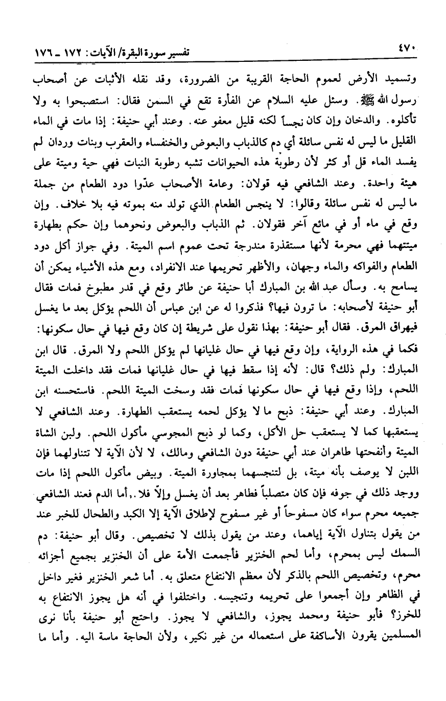 فكما في هذه الرواية، وإن وقع فيها في حال غليانها لم يؤكل اللحم ولا المرق. قال ابن المبارك: ولم ذلك؟ قال: لأنه إذا سقط فيها في حال غليانها فمات فقد داخلت الميتة اللحم، وإذا وقع فيها في حال سكونها فمات فقد وسخت الميتة اللحم. فاستحسنه ابن المبارك. وعند أبي حنيفة: ذبح ما لا يؤكل لحمه يستعقب الطهارة. وعند الشافعي لا يستعقبها كما لا يستعقب حل الأكل، وكما لو ذبح المجوسي مأكول اللحم. ولبن الشاة الميتة وأنفحتها طاهران عند أبي حنيفة دون الشافعي ومالك، لا لأن الآية لا تتناولهما فإن اللبن لا يوصف بأن ميتة، بل لتنجسهما بمجاورة الميتة. وبيض مأكول اللحم إذا مات ووجد ذلك في جوفه فإن كان متصلبا فطاهر بعد أن يغسل وإلّا فلا. وأما الدم فعند الشافعي جميعه محرم سواء كان مسفوحا أو غير مسفوح لإطلاق الآية إلا الكبد والطحال للخبر عند من يقول بتناول الآية إياهما، وعند من يقول بذلك لا تخصيص. وقال أبو حنيفة: دم السمك ليس بمحرم، وأما لحم الخنزير فأجمعت الأمة على أن الخنزير بجميع أجزائه محرم، وتخصيص اللحم بالذكر لأن معظم الانتفاع متعلق به. أما شعر الخنزير فغير داخل في الظاهر وإن أجمعوا على تحريمه وتنجيسه. واختلفوا في أنه هل يجوز الانتفاع به للخرز؟ فأبو حنيفة ومحمد يجوز، والشافعي لا يجوز. واحتج أبو حنيفة بأنا نرى المسلمين يقرون الأساكفة على استعماله من غير نكير، ولأن الحاجة ماسة اليه. وأما ما