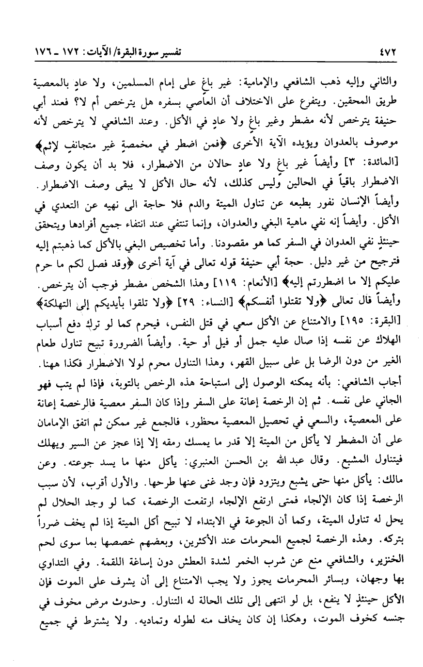 والثاني وإليه ذهب الشافعي والإمامية: غير باغ على إمام المسلمين، ولا عاد بالمعصية طريق المحقين. ويتفرع على الاختلاف أن العاصي بسفره هل يترخص أم لا؟ فعند أبي حنيفة يترخص لأنه مضطر وغير باغ ولا عاد في الأكل. وعند الشافعي لا يترخص لأنه موصوف بالعدوان ويؤيده الآية الأخرى فَمَنِ اضْطُرَّ فِي مَخْمَصَةٍ غَيْرَ مُتَجانِفٍ لِإِثْمٍ [المائدة: 3] وأيضا غير باغ ولا عاد حالان من الاضطرار، فلا بد أن يكون وصف الاضطرار باقيا في الحالين وليس كذلك، لأنه حال الأكل لا يبقى وصف الاضطرار.