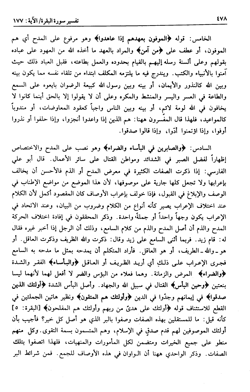 السادس: وَالصَّابِرِينَ فِي الْبَأْساءِ وَالضَّرَّاءِ وهو نصب على المدح والاختصاص إظهارا لفضل الصبر في الشدائد ومواطن القتال على سائر الأعمال. قال أبو علي الفارسي: إذا ذكرت الصفات الكثيرة في معرض المدح أو الذم فالأحسن أن يخالف بإعرابها ولا تجعل كلها جارية على موصوفها، لأن هذا الموضع من مواضع الإطناب في الوصف والإبلاغ في القبول، فإذا خولف بإعراب الأوصاف كان المقصود أكمل لأن الكلام عند اختلاف الإعراب يصير كأنه أنواع من الكلام وضروب من البيان، وعند الاتحاد في الإعراب يكون وجها واحدا أو جملة واحدة. وذكر المحققون في إفادة اختلاف الحركة المدح والذم أن أصل المدح والذم من كلام السامع، وذلك أن الرجل إذا أخبر غيره فقال له: قام زيد. فربما أثنى السامع على زيد وقال: ذكرت والله الظريف وذكرت العاقل. أو هو- والله- الطريف، أو هو العاقل. فأراد المتكلم أن يمدحه بمثل ما مدحه به السامع فجرى الإعراب على ذلك أي أريد الظريف أو العاقل والْبَأْساءِ الفقر والشدة وَالضَّرَّاءِ المرض والزمانة. وهما فعلاء من البؤس والضر لا أفعل لهما لأنهما ليسا بنعتين وَحِينَ الْبَأْسِ القتال في سبيل الله والجهاد. وأصل البأس الشدة أُولئِكَ الَّذِينَ صَدَقُوا في إيمانهم وجدّوا في الدين وَأُولئِكَ هُمُ الْمُتَّقُونَ ونظير هاتين الجملتين في القطع للاستئناف قوله أُولئِكَ عَلى هُدىً مِنْ رَبِّهِمْ وَأُولئِكَ هُمُ الْمُفْلِحُونَ [البقرة: 5] كأنه قيل: ما للمستقلين بهذه الصفات وصفوا بالبر الذي هو أصل كل خير؟ فأجيب بأن أولئك الموصوفين لهم قدم صدق في الإسلام، وهم المتسمون بسمة التقوى. وكل منهم منطو على جميع الخيرات ومتضمن لكل المأمورات والمنهيات، فلهذا اتصفوا بتلك الصفات. وذكر الواحدي هاهنا أن الواوان في هذه الأوصاف للجمع. فمن شرائط البر