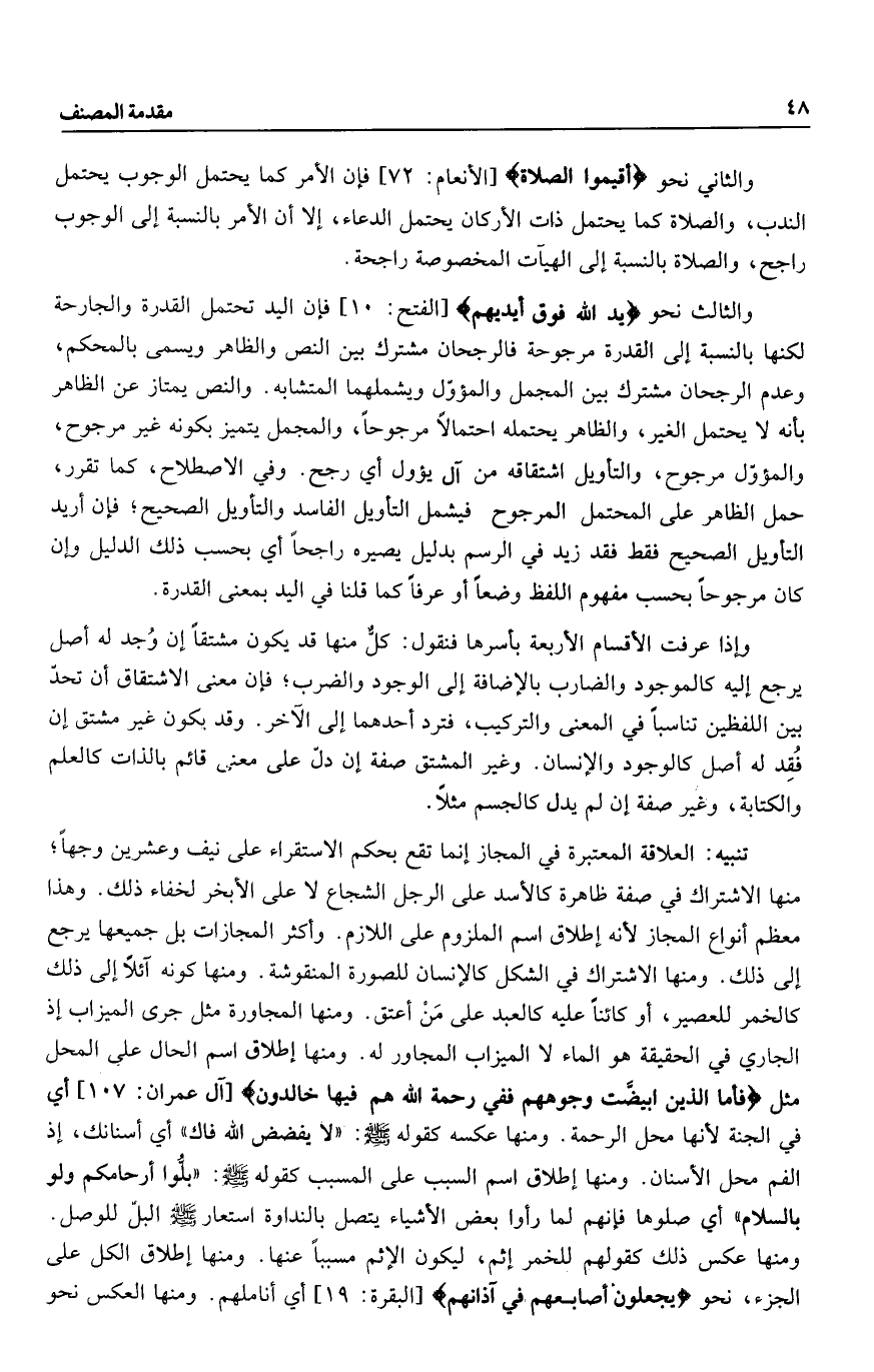 والثالث نحو يَدُ اللَّهِ فَوْقَ أَيْدِيهِمْ [الفتح: 10] فإن اليد تحتمل القدرة والجارحة لكنها بالنسبة إلى القدرة مرجوحة فالرجحان مشترك بين النص والظاهر ويسمى بالمحكم، وعدم الرجحان مشترك بين المجمل والمؤوّل ويشملهما المتشابه. والنص يمتاز عن الظاهر بأنه لا يحتمل الغير، والظاهر يحتمله احتمالا مرجوحا، والمجمل يتميز بكونه غير مرجوح، والمؤوّل مرجوح، والتأويل اشتقاقه من آل يؤول أي رجح. وفي الاصطلاح، كما تقرر، حمل الظاهر على المحتمل المرجوح فيشمل التأويل الفاسد والتأويل الصحيح فإن أريد التأويل الصحيح فقط فقد زيد في الرسم بدليل يصيره راجحا أي بحسب ذلك الدليل وإن كان مرجوحا بحسب مفهوم اللفظ وضعا أو عرفا كما قلنا في اليد بمعنى القدرة.