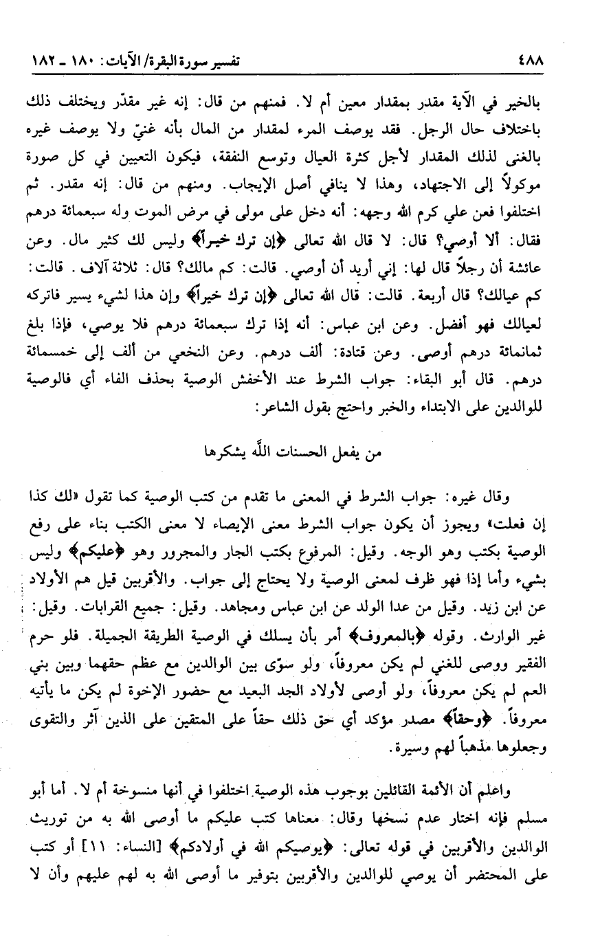 من يفعل الحسنات الله يشكرها وقال غيره: جواب الشرط في المعنى ما تقدم من كتب الوصية كما تقول «لك كذا إن فعلت» ويجوز أن يكون جواب الشرط معنى الإيصاء لا معنى الكتب بناء على رفع الوصية بكتب وهو الوجه. وقيل: المرفوع بكتب الجار والمجرور وهو عَلَيْكُمْ وليس بشيء وأما إذا فهو ظرف لمعنى الوصية ولا يحتاج إلى جواب. والأقربين قيل هم الأولاد عن ابن زيد. وقيل من عدا الولد عن ابن عباس ومجاهد. وقيل: جميع القرابات. وقيل:
