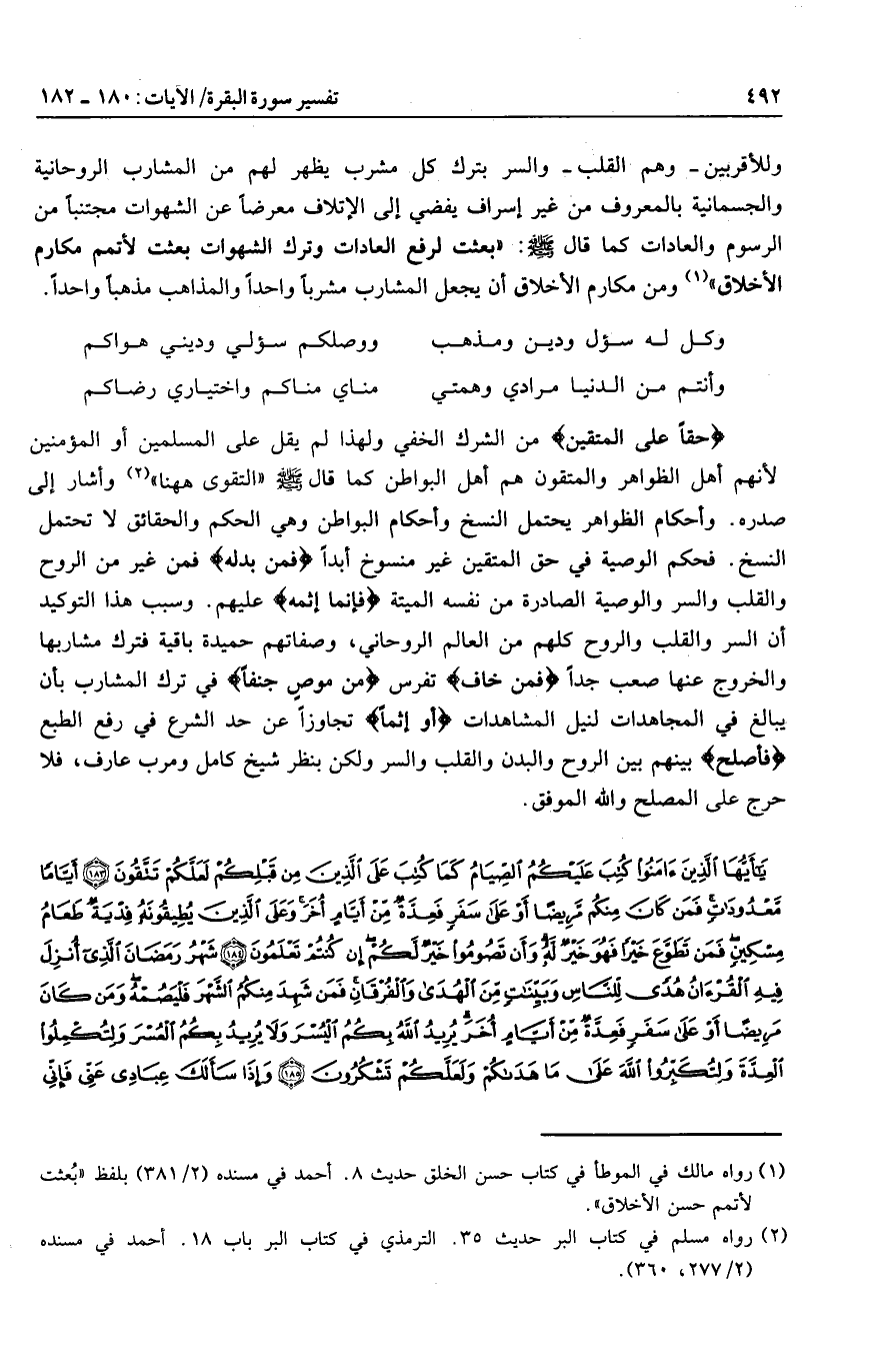 وأحكام الظواهر يحتمل النسخ وأحكام البواطن وهي الحكم والحقائق لا تحتمل النسخ. فحكم الوصية في حق المتقين غير منسوخ أبدا فَمَنْ بَدَّلَهُ فمن غير من الروح والقلب والسر والوصية الصادرة من نفسه الميتة فَإِنَّما إِثْمُهُ عليهم. وسبب هذا التوكيد أن السر والقلب والروح كلهم من العالم الروحاني، وصفاتهم حميدة باقية فترك مشاربها والخروج عنها صعب جدا فَمَنْ خافَ تفرس مِنْ مُوصٍ جَنَفاً في ترك المشارب بأن يبالغ في المجاهدات لنيل المشاهدات أَوْ إِثْماً تجاوزا عن حد الشرع في رفع الطبع فَأَصْلَحَ بينهم بين الروح والبدن والقلب والسر ولكن بنظر شيخ كامل ومرب عارف، فلا حرج على المصلح والله الموفق.