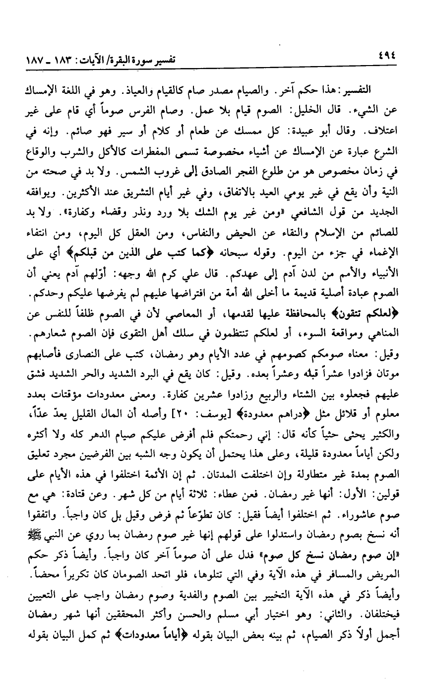 وأيضا ذكر في هذه الآية التخيير بين الصوم والفدية وصوم رمضان واجب على التعيين فيختلفان. والثاني: وهو اختيار أبي مسلم والحسن وأكثر المحققين أنها شهر رمضان أجمل أولا ذكر الصيام، ثم بينه بعض البيان بقوله أَيَّاماً مَعْدُوداتٍ ثم كمل البيان بقوله