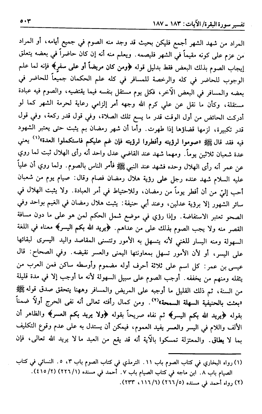 ، وللاحتياط في أمر العبادة. ولا يثبت الهلال في سائر الشهور إلا برؤية عدلين، وعند أبي حنيفة: يثبت هلال رمضان في الغيم بواحد وفي الصحو تعتبر الاستفاضة. وإذا رؤي في موضع شمل الحكم لمن هو على ما دون مسافة القصر منه ولا يجب الصوم بذلك على من عداهم. يُرِيدُ اللَّهُ بِكُمُ الْيُسْرَ معناه في اللغة السهولة ومنه اليسار للغني لأنه يتسهل به الأمور وتتسنى المقاصد واليد اليسرى لبقائها على اليسر، أو لأن الأمور تسهل بمعاونتها اليمنى والعسر نقيضه. وفي الصحاح: قال عيسى بن عمر: كل اسم على ثلاثة أحرف أوله مضموم وأوسطه ساكن فمن العرب من يثقله ومنهم من يخففه. أوجب الصوم على سبيل السهولة لأنه ما أوجب إلا في مدة قليلة من السنة، ثم ذلك القليل ما أوجبه على المريض والمسافر وهاهنا يتحقق صدق