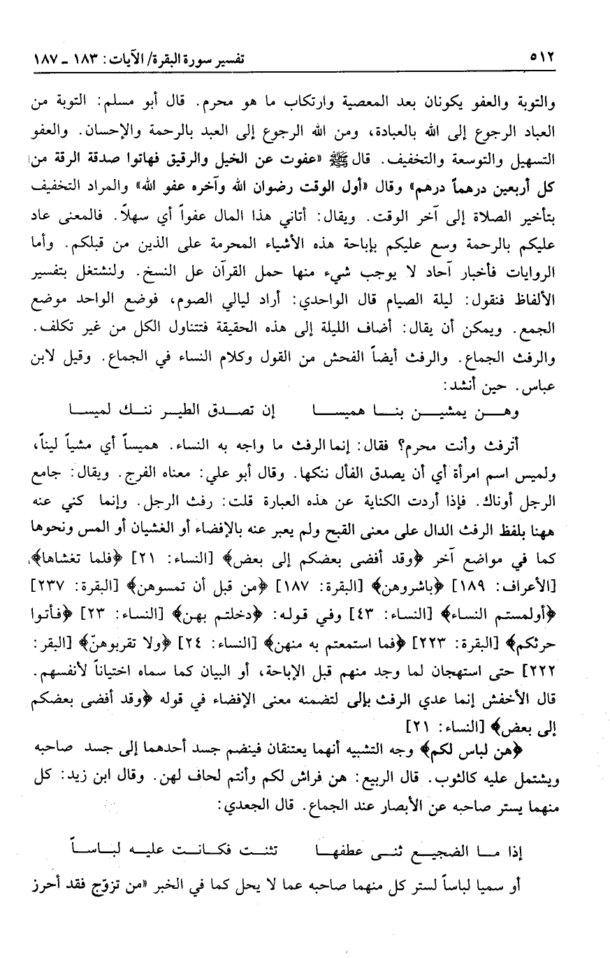 والمراد التخفيف بتأخير الصلاة إلى آخر الوقت. ويقال: أتاني هذا المال عفوا أي سهلا. فالمعنى عاد عليكم بالرحمة وسع عليكم بإباحة هذه الأشياء المحرمة على الذين من قبلكم. وأما الروايات فأخبار آحاد لا يوجب شيء منها حمل القرآن عل النسخ. ولنشتغل بتفسير الألفاظ فنقول: ليلة الصيام قال الواحدي: أراد ليالي الصوم، فوضع الواحد موضع الجمع. ويمكن أن يقال: أضاف الليلة إلى هذه الحقيقة فتتناول الكل من غير تكلف.