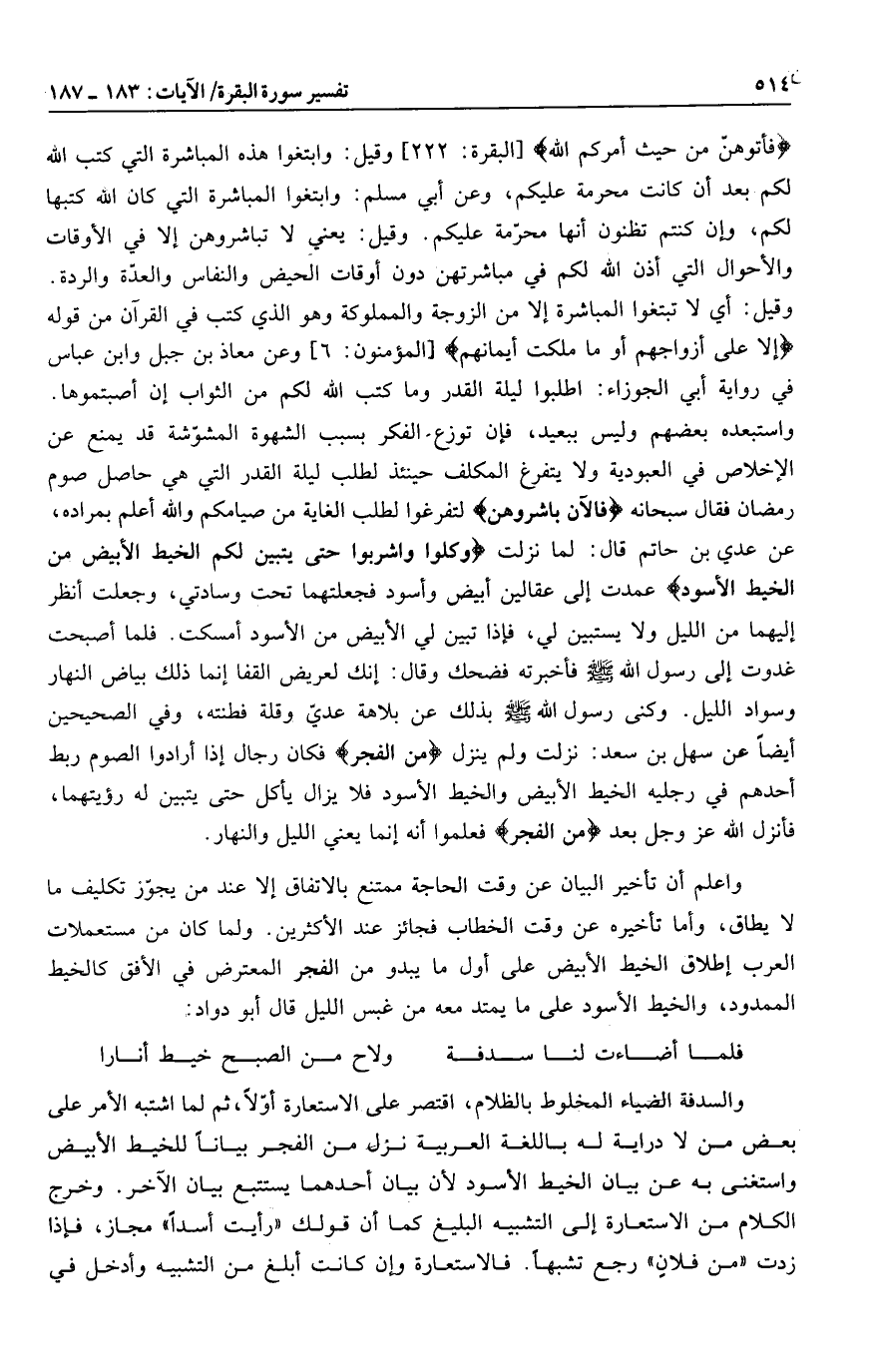 والسدفة الضياء المخلوط بالظلام، اقتصر على الاستعارة أوّلا، ثم لما اشتبه الأمر على بعض من لا دراية له باللغة العربية نزل من الفجر بيانا للخيط الأبيض واستغنى به عن بيان الخيط الأسود لأن بيان أحدهما يستتبع بيان الآخر. وخرج الكلام من الاستعارة إلى التشبيه البليغ كما أن قولك «رأيت أسدا» مجاز، فإذا زدت «من فلان» رجع تشبها. فالاستعارة وإن كانت أبلغ من التشبيه وأدخل في