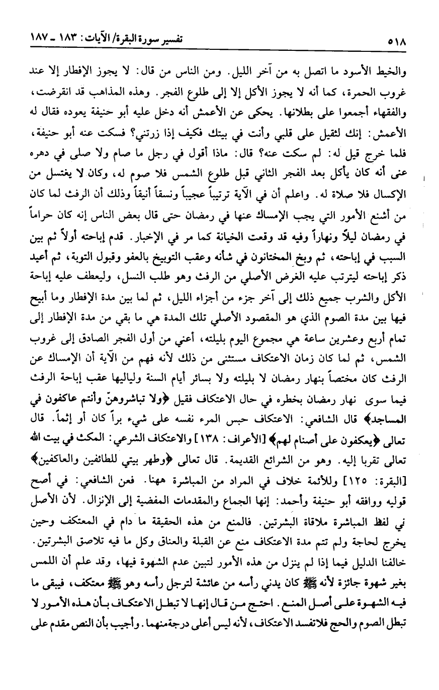 والخيط الأسود ما اتصل به من آخر الليل. ومن الناس من قال: لا يجوز الإفطار إلا عند غروب الحمرة، كما أنه لا يجوز الأكل إلا إلى طلوع الفجر. وهذه المذاهب قد انقرضت، والفقهاء أجمعوا على بطلانها. يحكى عن الأعمش أنه دخل عليه أبو حنيفة يعوده فقال له الأعمش: إنك لثقيل على قلبي وأنت في بيتك فكيف إذا زرتني؟ فسكت عنه أبو حنيفة، فلما خرج قيل له: لم سكت عنه؟ قال: ماذا أقول في رجل ما صام ولا صلى في دهره عنى أنه كان يأكل بعد الفجر الثاني قبل طلوع الشمس فلا صوم له، وكان لا يغتسل من الإكسال فلا صلاة له. واعلم أن في الآية ترتيبا عجيبا ونسقا أنيقا وذلك أن الرفث لما كان من أشنع الأمور التي يجب الإمساك عنها في رمضان حتى قال بعض الناس إنه كان حراما في رمضان ليلا ونهارا وفيه قد وقعت الخيانة كما مر في الإخبار. قدم إباحته أولا ثم بين السبب في إباحته، ثم وبخ المختانون في شأنه وعقب التوبيخ بالعفو وقبول التوبة، ثم أعيد ذكر إباحته ليترتب عليه الغرض الأصلي من الرفث وهو طلب النسل، وليعطف عليه إباحة الأكل والشرب جميع ذلك إلى آخر جزء من أجزاء الليل، ثم لما بين مدة الإفطار وما أبيح فيها بين مدة الصوم الذي هو المقصود الأصلي تلك المدة هي ما بقي من مدة الإفطار إلى تمام أربع وعشرين ساعة هي مجموع اليوم بليلته، أعني من أول الفجر الصادق إلى غروب الشمس، ثم لما كان زمان الاعتكاف مستثنى من ذلك لأنه فهم من الآية أن الإمساك عن الرفث كان مختصا بنهار رمضان لا بليلته ولا بسائر أيام السنة ولياليها عقب إباحة الرفث فيما سوى نهار رمضان بخطره في حال الاعتكاف فقيل وَلا تُبَاشِرُوهُنَّ وَأَنْتُمْ عاكِفُونَ فِي الْمَساجِدِ