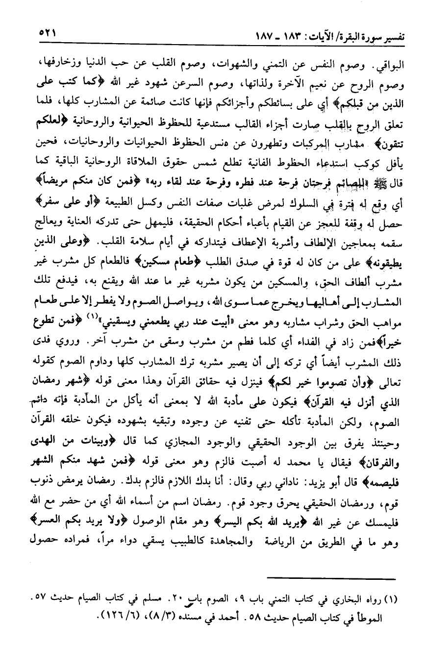 فَمَنْ تَطَوَّعَ خَيْراً فمن زاد في الفداء أي كلما فطم من مشرب وسقى من مشرب آخر. وروي فدى ذلك المشرب أيضا أي تركه إلى أن يصير مشربه ترك المشارب كلها وداوم الصوم كقوله تعالى وَأَنْ تَصُومُوا خَيْرٌ لَكُمْ فينزل فيه حقائق القرآن وهذا معنى قوله شَهْرُ رَمَضانَ الَّذِي أُنْزِلَ فِيهِ الْقُرْآنُ فيكون على مأدبة الله لا بمعنى أنه يأكل من المأدبة فإنه دائم الصوم، ولكن المأدبة تأكله حتى تفنيه عن وجوده وتبقيه بشهوده فيكون خلقه القرآن وحينئذ يفرق بين الوجود الحقيقي والوجود المجازي كما قال وَبَيِّناتٍ مِنَ الْهُدى وَالْفُرْقانِ فيقال يا محمد له أصبت فالزم وهو معنى قوله فَمَنْ شَهِدَ مِنْكُمُ الشَّهْرَ فَلْيَصُمْهُ قال أبو يزيد: ناداني ربي وقال: أنا بدك اللازم فالزم بدك. رمضان يرمض ذنوب قوم، ورمضان الحقيقي يحرق وجود قوم. رمضان اسم من أسماء الله أي من حضر مع الله فليمسك عن غير الله يُرِيدُ اللَّهُ بِكُمُ الْيُسْرَ وهو مقام الوصول وَلا يُرِيدُ بِكُمُ الْعُسْرَ وهو ما في الطريق من الرياضة والمجاهدة كالطبيب يسقي دواء مرا، فمراده حصول