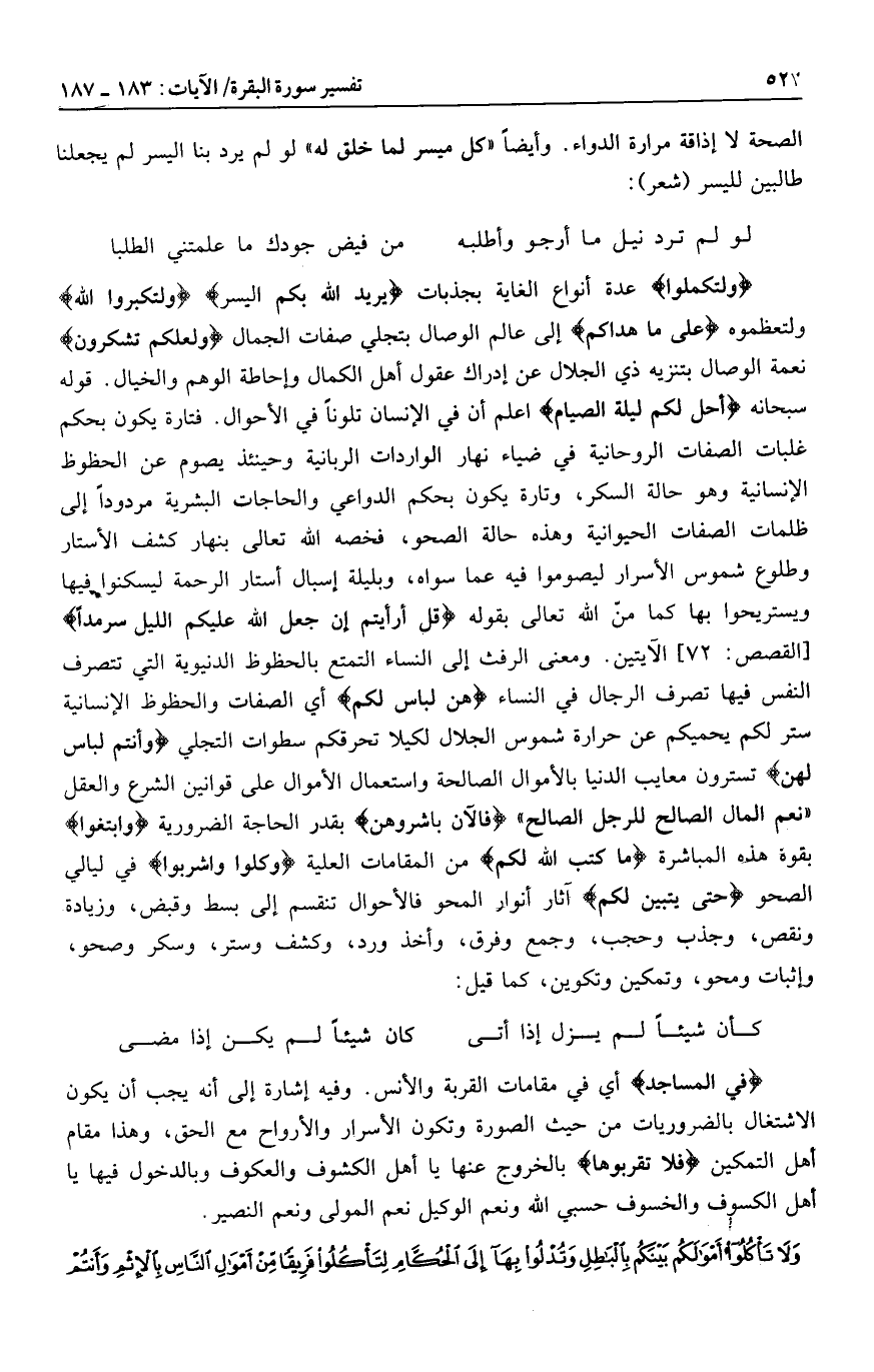وَلِتُكْمِلُوا عدة أنواع الغاية بجذبات يُرِيدُ اللَّهُ بِكُمُ الْيُسْرَ وَلِتُكَبِّرُوا اللَّهَ ولتعظموه عَلى ما هَداكُمْ إلى عالم الوصال بتجلي صفات الجمال وَلَعَلَّكُمْ تَشْكُرُونَ نعمة الوصال بتنزيه ذي الجلال عن إدراك عقول أهل الكمال وإحاطة الوهم والخيال. قوله سبحانه أُحِلَّ لَكُمْ لَيْلَةَ الصِّيامِ اعلم أن في الإنسان تلونا في الأحوال. فتارة يكون بحكم غلبات الصفات الروحانية في ضياء نهار الواردات الربانية وحينئذ يصوم عن الحظوظ الإنسانية وهو حالة السكر، وتارة يكون بحكم الدواعي والحاجات البشرية مردودا إلى ظلمات الصفات الحيوانية وهذه حالة الصحو، فخصه الله تعالى بنهار كشف الأستار وطلوع شموس الأسرار ليصوموا فيه عما سواه، وبليلة إسبال أستار الرحمة ليسكنوا فيها ويستريحوا بها كما منّ الله تعالى بقوله قُلْ أَرَأَيْتُمْ إِنْ جَعَلَ اللَّهُ عَلَيْكُمُ اللَّيْلَ سَرْمَداً [القصص: 72] الآيتين. ومعنى الرفث إلى النساء التمتع بالحظوظ الدنيوية التي تتصرف النفس فيها تصرف الرجال في النساء هُنَّ لِباسٌ لَكُمْ أي الصفات والحظوظ الإنسانية ستر لكم يحميكم عن حرارة شموس الجلال لكيلا تحرقكم سطوات التجلي وَأَنْتُمْ لِباسٌ لَهُنَّ تسترون معايب الدنيا بالأموال الصالحة واستعمال الأموال على قوانين الشرع والعقل «نعم المال الصالح للرجل الصالح» فَالْآنَ بَاشِرُوهُنَّ بقدر الحاجة الضرورية وَابْتَغُوا بقوة هذه المباشرة ما كَتَبَ اللَّهُ لَكُمْ من المقامات العلية وَكُلُوا وَاشْرَبُوا في ليالي الصحو حَتَّى يَتَبَيَّنَ لَكُمُ آثار أنوار المحو فالأحوال تنقسم إلى بسط وقبض، وزيادة ونقص، وجذب وحجب، وجمع وفرق، وأخذ ورد، وكشف وستر، وسكر وصحو، وإثبات ومحو، وتمكين وتكوين، كما قيل: